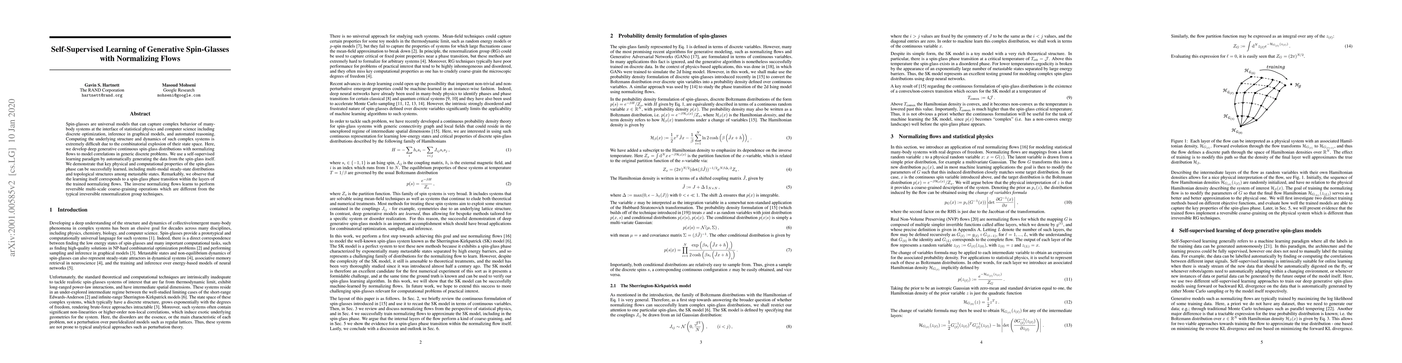This paper develops deep generative models using normalizing flows for self-supervised learning of spin-glasses, capturing complex many-body systems' behavior. It demonstrates successful learning of spin-glass properties, including multi-modal distributions and metastable state structures, revealing a spin-glass phase transition during training.
