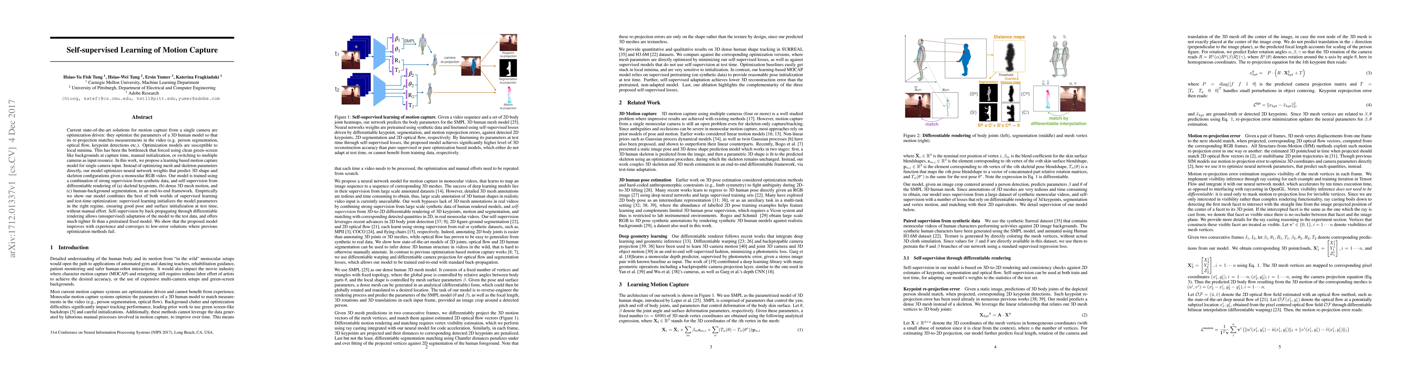 This paper proposes a learning-based motion capture model that optimizes neural network weights for 3D shape and skeleton configurations from monocular RGB video, combining supervised learning with self-supervision from differentiable rendering.