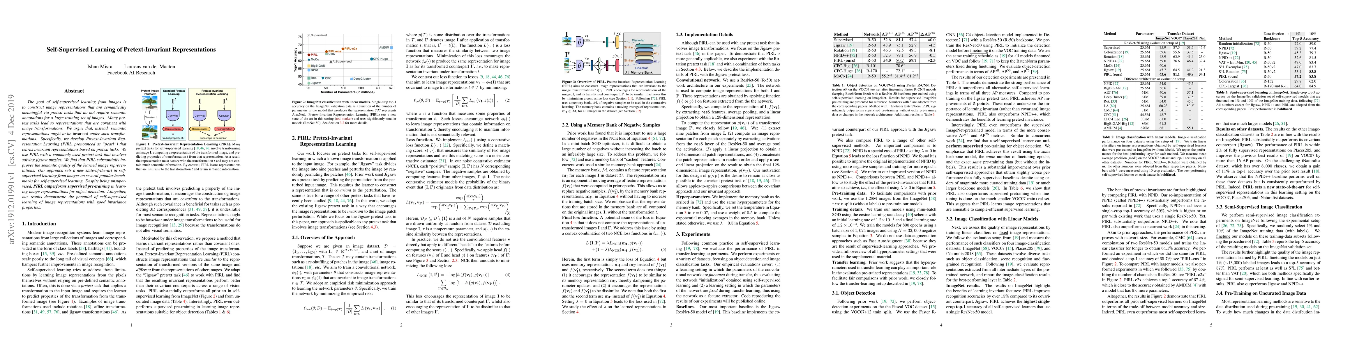 This paper introduces Pretext-Invariant Representation Learning (PIRL) to create semantically meaningful image representations via self-supervised learning using a jigsaw puzzle pretext task. PIRL improves representation invariance under transformations, achieving state-of-the-art performance on self-supervised benchmarks and outperforming supervised pre-training for object detection.
