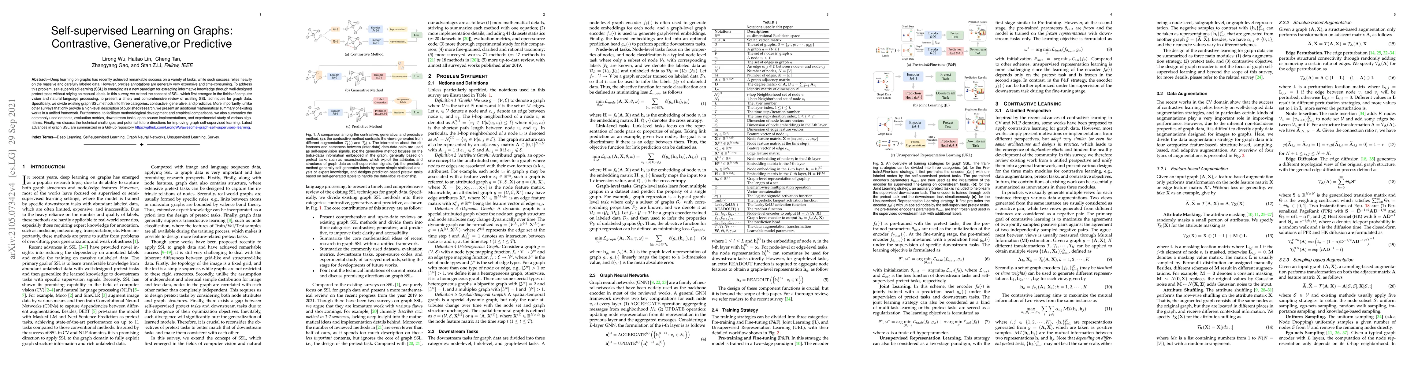 Deep learning on graphs has recently achieved remarkable success on a variety of tasks, while such success relies heavily on the massive and carefully labeled data. However, precise annotations are generally very expensive and time-consuming. To address this problem, self-supervised learning (SSL) is emerging as a new paradigm for extracting informative knowledge through well-designed pretext tasks without relying on manual labels. In this survey, we extend the concept of SSL, which first emerged in the fields of computer vision and natural language processing, to present a timely and comprehensive review of existing SSL techniques for graph data. Specifically, we divide existing graph SSL methods into three categories: contrastive, generative, and predictive. More importantly, unlike other surveys that only provide a high-level description of published research, we present an additional mathematical summary of existing works in a unified framework. Furthermore, to facilitate methodological development and empirical comparisons, we also summarize the commonly used datasets, evaluation metrics, downstream tasks, open-source implementations, and experimental study of various algorithms. Finally, we discuss the technical challenges and potential future directions for improving graph self-supervised learning. Latest advances in graph SSL are summarized in a GitHub repository https://github.com/LirongWu/awesome-graph-self-supervised-learning.