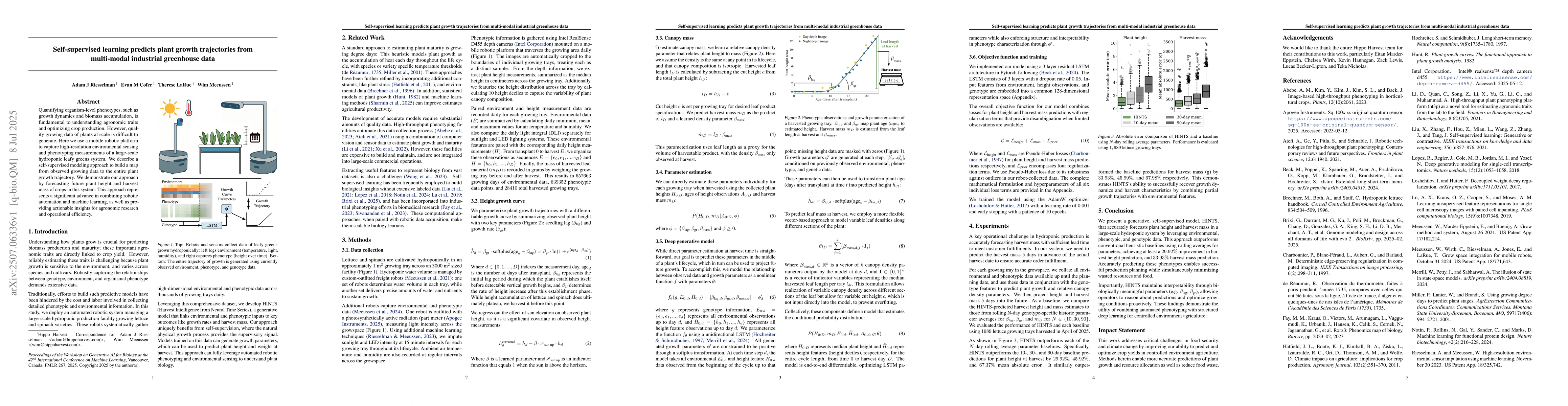 Quantifying organism-level phenotypes, such as growth dynamics and biomass accumulation, is fundamental to understanding agronomic traits and optimizing crop production. However, quality growing data of plants at scale is difficult to generate. Here we use a mobile robotic platform to capture high-resolution environmental sensing and phenotyping measurements of a large-scale hydroponic leafy greens system. We describe a self-supervised modeling approach to build a map from observed growing data to the entire plant growth trajectory. We demonstrate our approach by forecasting future plant height and harvest mass of crops in this system. This approach represents a significant advance in combining robotic automation and machine learning, as well as providing actionable insights for agronomic research and operational efficiency.
