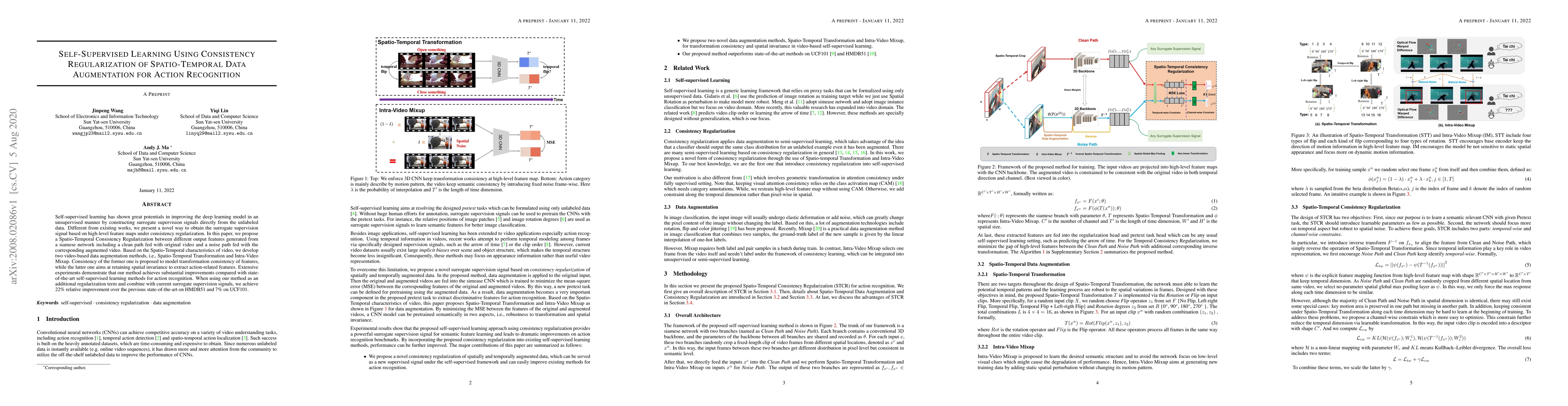 This paper proposes a self-supervised learning method for action recognition using consistency regularization with spatio-temporal data augmentation. It introduces Spatio-Temporal Consistency Regularization and two augmentation techniques, achieving significant improvements over existing methods, with a 22% relative gain on HMDB51 and 7% on UCF101.