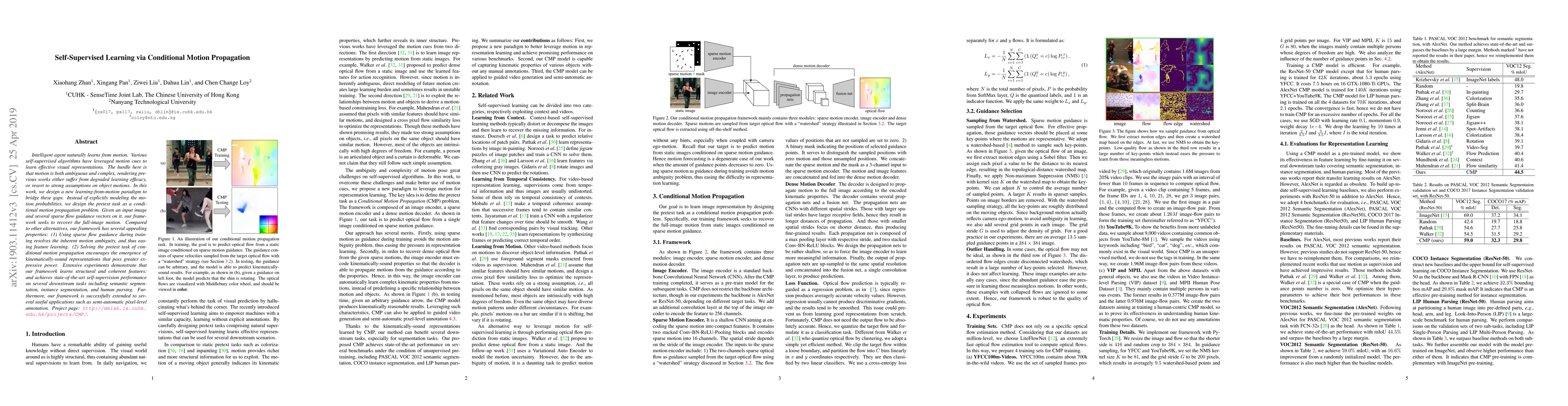 Intelligent agent naturally learns from motion. Various self-supervised algorithms have leveraged motion cues to learn effective visual representations. The hurdle here is that motion is both ambiguous and complex, rendering previous works either suffer from degraded learning efficacy, or resort to strong assumptions on object motions. In this work, we design a new learning-from-motion paradigm to bridge these gaps. Instead of explicitly modeling the motion probabilities, we design the pretext task as a conditional motion propagation problem. Given an input image and several sparse flow guidance vectors on it, our framework seeks to recover the full-image motion. Compared to other alternatives, our framework has several appealing properties: (1) Using sparse flow guidance during training resolves the inherent motion ambiguity, and thus easing feature learning. (2) Solving the pretext task of conditional motion propagation encourages the emergence of kinematically-sound representations that poss greater expressive power. Extensive experiments demonstrate that our framework learns structural and coherent features; and achieves state-of-the-art self-supervision performance on several downstream tasks including semantic segmentation, instance segmentation, and human parsing. Furthermore, our framework is successfully extended to several useful applications such as semi-automatic pixel-level annotation. Project page: "http://mmlab.ie.cuhk.edu.hk/projects/CMP/".
