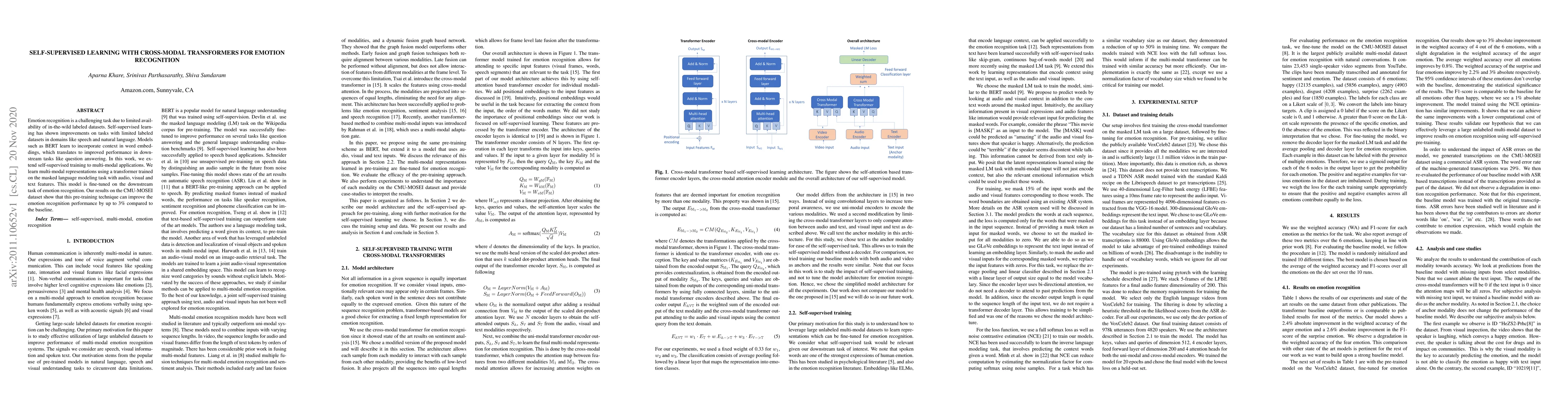 This paper explores self-supervised learning with cross-modal transformers for emotion recognition, demonstrating improved performance by up to 3% on the CMU-MOSEI dataset compared to baselines. The approach uses multi-modal representations learned through transformer-based masked language modeling on audio, visual, and text features.