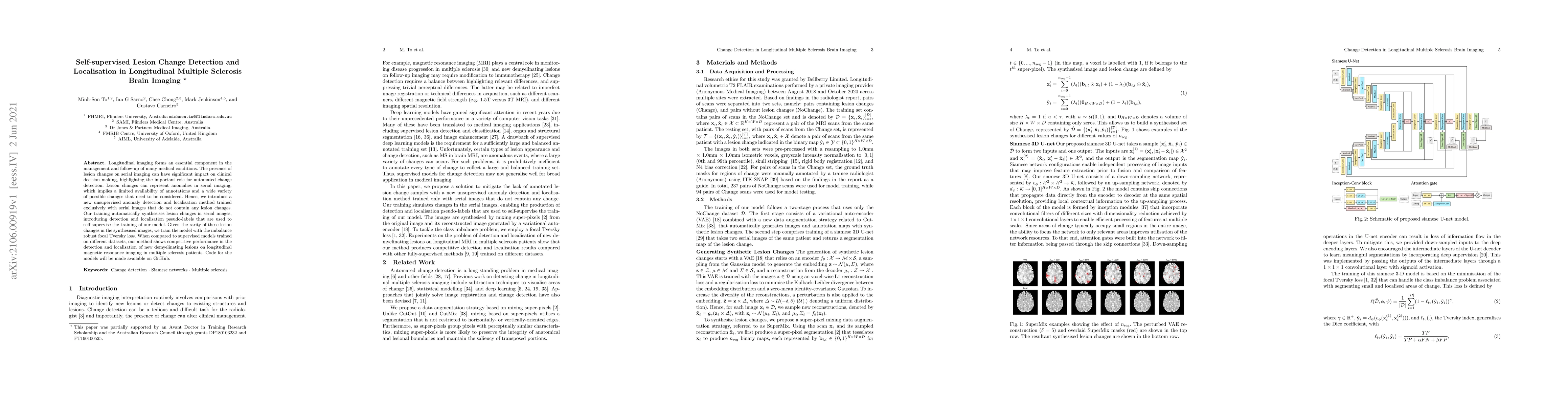 This paper introduces an unsupervised method for detecting and localizing lesion changes in longitudinal MRI scans of multiple sclerosis patients. The model is trained using only images without lesion changes, synthesizing changes to generate pseudo-labels, and demonstrates competitive performance compared to supervised models.