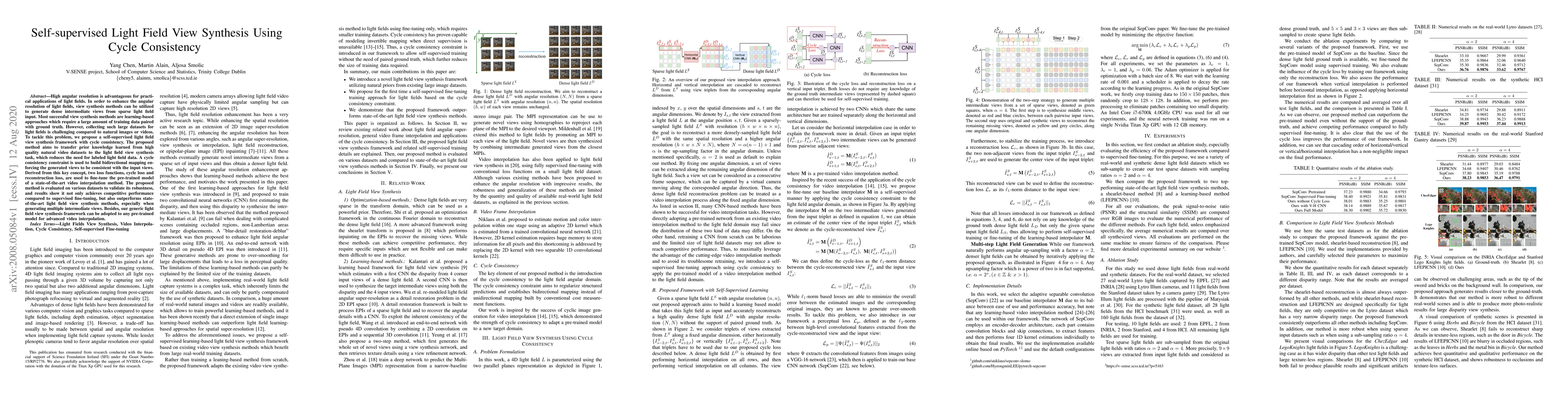 This paper proposes a self-supervised light field view synthesis framework using cycle consistency to enhance angular resolution without requiring large labeled light field datasets. It leverages prior knowledge from natural video datasets and achieves competitive performance compared to supervised methods.