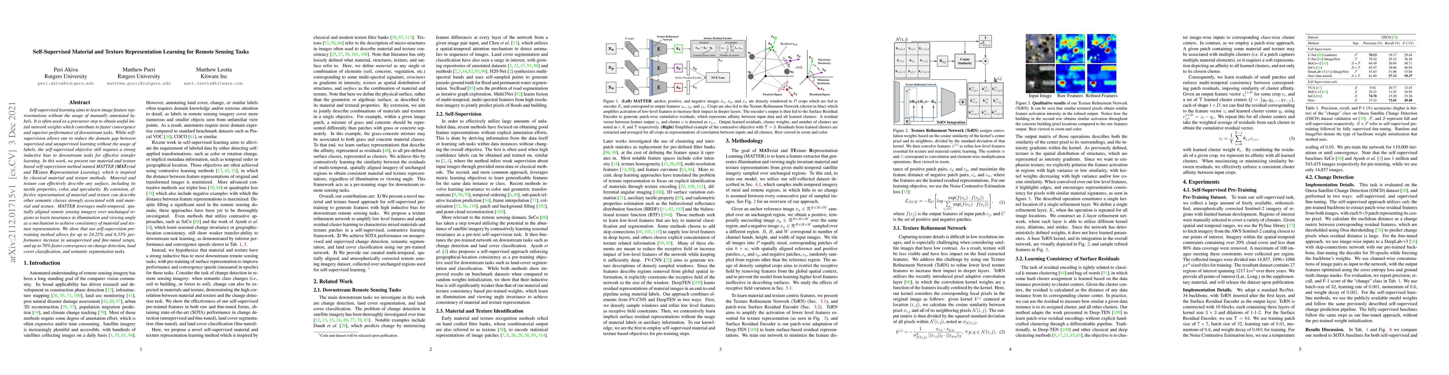 This paper introduces MATTER, a self-supervised learning method for material and texture representation in remote sensing tasks, leveraging multi-temporal imagery. It demonstrates significant performance improvements and faster convergence in various downstream tasks.