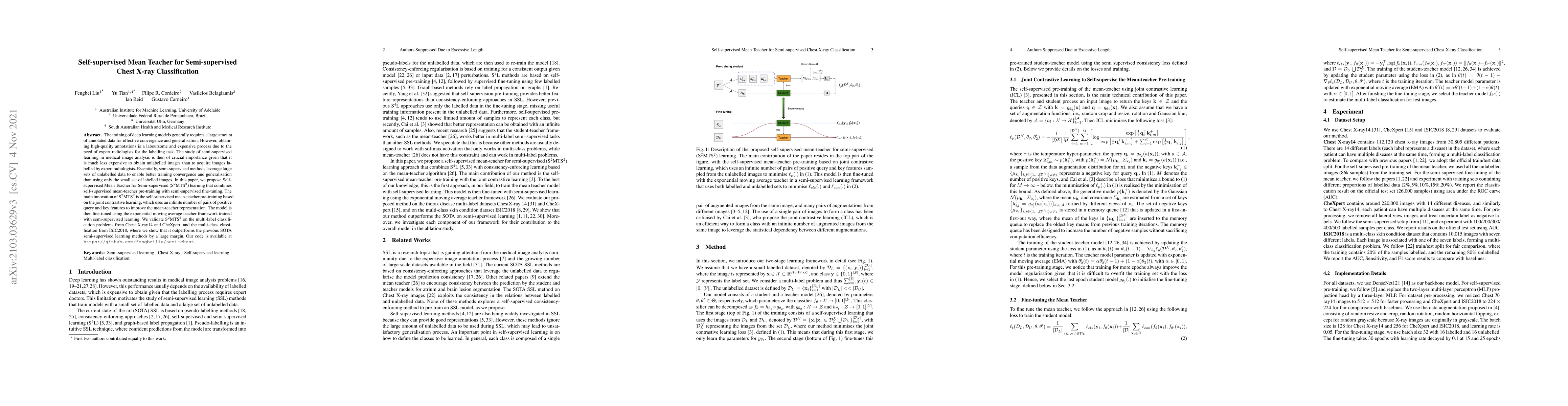 The training of deep learning models generally requires a large amount of annotated data for effective convergence and generalisation. However, obtaining high-quality annotations is a laboursome and expensive process due to the need of expert radiologists for the labelling task. The study of semi-supervised learning in medical image analysis is then of crucial importance given that it is much less expensive to obtain unlabelled images than to acquire images labelled by expert radiologists. Essentially, semi-supervised methods leverage large sets of unlabelled data to enable better training convergence and generalisation than using only the small set of labelled images. In this paper, we propose Self-supervised Mean Teacher for Semi-supervised (S$^2$MTS$^2$) learning that combines self-supervised mean-teacher pre-training with semi-supervised fine-tuning. The main innovation of S$^2$MTS$^2$ is the self-supervised mean-teacher pre-training based on the joint contrastive learning, which uses an infinite number of pairs of positive query and key features to improve the mean-teacher representation. The model is then fine-tuned using the exponential moving average teacher framework trained with semi-supervised learning. We validate S$^2$MTS$^2$ on the multi-label classification problems from Chest X-ray14 and CheXpert, and the multi-class classification from ISIC2018, where we show that it outperforms the previous SOTA semi-supervised learning methods by a large margin.