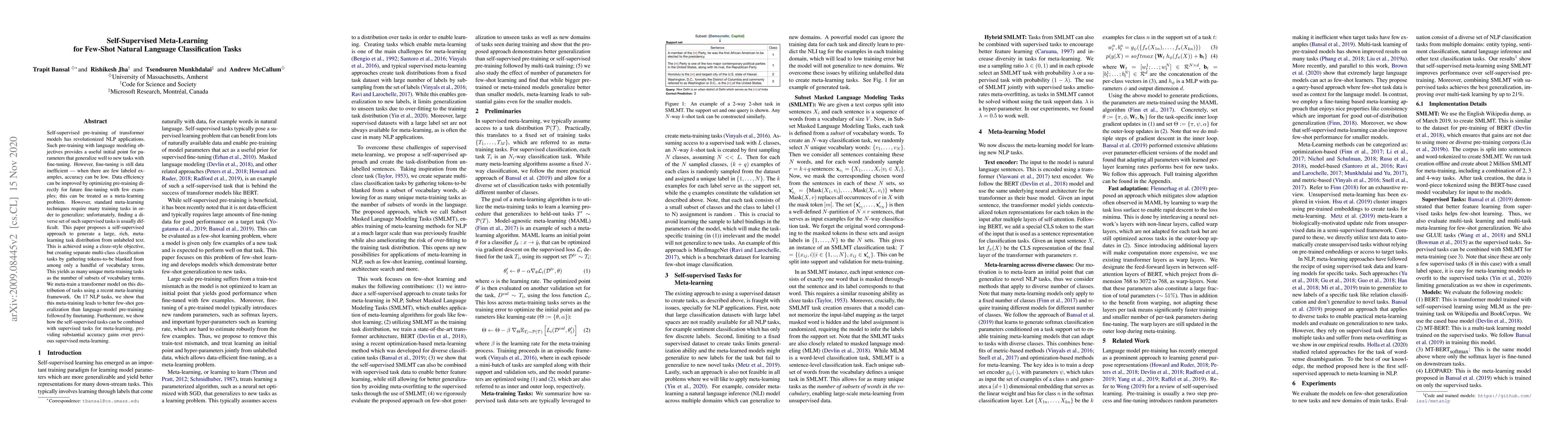 Self-supervised pre-training of transformer models has revolutionized NLP applications. Such pre-training with language modeling objectives provides a useful initial point for parameters that generalize well to new tasks with fine-tuning. However, fine-tuning is still data inefficient -- when there are few labeled examples, accuracy can be low. Data efficiency can be improved by optimizing pre-training directly for future fine-tuning with few examples; this can be treated as a meta-learning problem. However, standard meta-learning techniques require many training tasks in order to generalize; unfortunately, finding a diverse set of such supervised tasks is usually difficult. This paper proposes a self-supervised approach to generate a large, rich, meta-learning task distribution from unlabeled text. This is achieved using a cloze-style objective, but creating separate multi-class classification tasks by gathering tokens-to-be blanked from among only a handful of vocabulary terms. This yields as many unique meta-training tasks as the number of subsets of vocabulary terms. We meta-train a transformer model on this distribution of tasks using a recent meta-learning framework. On 17 NLP tasks, we show that this meta-training leads to better few-shot generalization than language-model pre-training followed by finetuning. Furthermore, we show how the self-supervised tasks can be combined with supervised tasks for meta-learning, providing substantial accuracy gains over previous supervised meta-learning.
