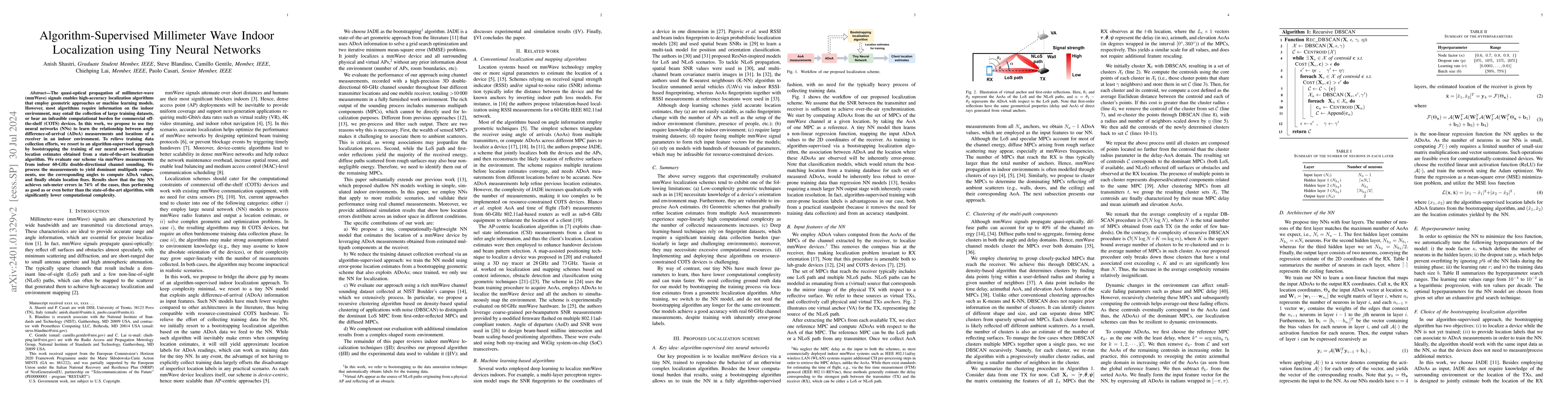 The quasi-optical propagation of millimeter-wave signals enables high-accuracy localization algorithms that employ geometric approaches or machine learning models. However, most algorithms require information on the indoor environment, may entail the collection of large training datasets, or bear an infeasible computational burden for commercial off-the-shelf (COTS) devices. In this work, we propose to use tiny neural networks (NNs) to learn the relationship between angle difference-of-arrival (ADoA) measurements and locations of a receiver in an indoor environment. To relieve training data collection efforts, we resort to a self-supervised approach by bootstrapping the training of our neural network through location estimates obtained from a state-of-the-art localization algorithm. We evaluate our scheme via mmWave measurements from indoor 60-GHz double-directional channel sounding. We process the measurements to yield dominant multipath components, use the corresponding angles to compute ADoA values, and finally obtain location fixes. Results show that the tiny NN achieves sub-meter errors in 74\% of the cases, thus performing as good as or even better than the state-of-the-art algorithm, with significantly lower computational complexity.