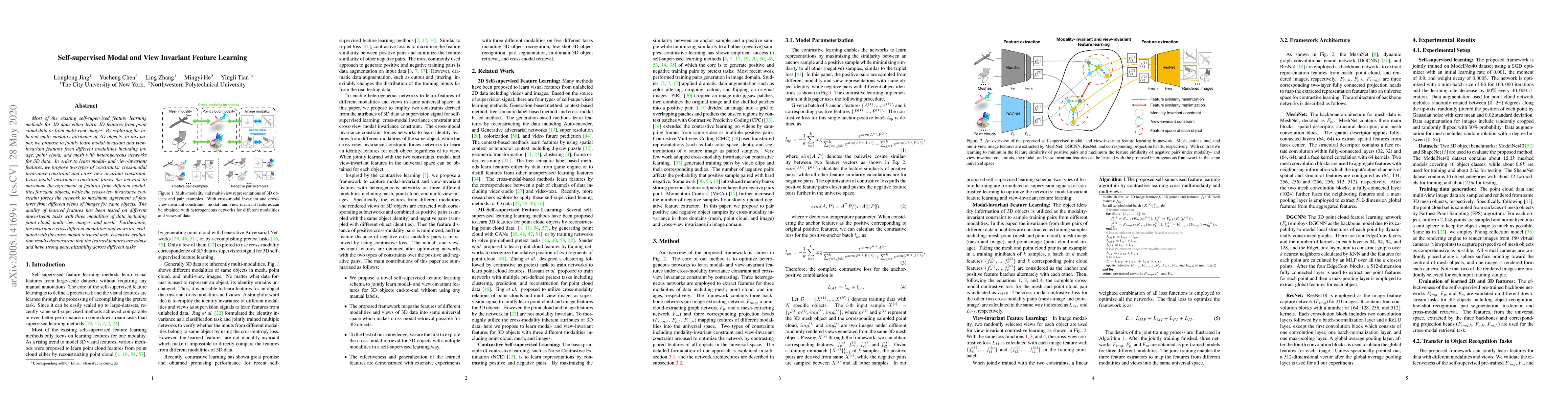 This paper proposes a self-supervised method to learn modal-invariant and view-invariant features from various 3D data modalities, including images, point clouds, and meshes, using cross-modal and cross-view constraints. The robustness and generalizability of the learned features are validated through downstream tasks and cross-modal retrieval, showing strong performance.