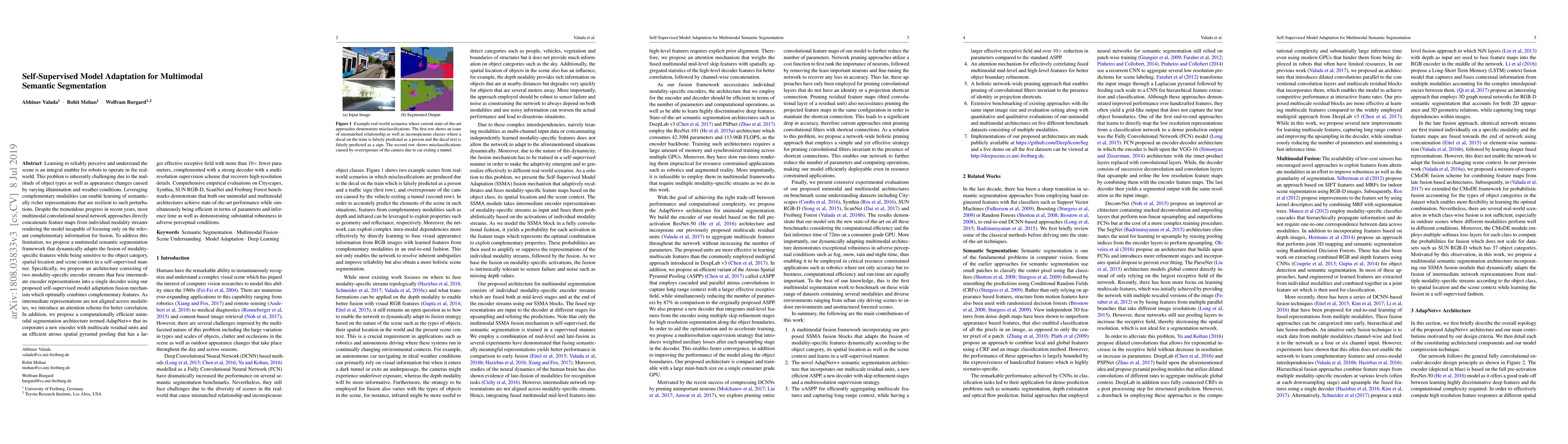 Learning to reliably perceive and understand the scene is an integral enabler for robots to operate in the real-world. This problem is inherently challenging due to the multitude of object types as well as appearance changes caused by varying illumination and weather conditions. Leveraging complementary modalities can enable learning of semantically richer representations that are resilient to such perturbations. Despite the tremendous progress in recent years, most multimodal convolutional neural network approaches directly concatenate feature maps from individual modality streams rendering the model incapable of focusing only on relevant complementary information for fusion. To address this limitation, we propose a mutimodal semantic segmentation framework that dynamically adapts the fusion of modality-specific features while being sensitive to the object category, spatial location and scene context in a self-supervised manner. Specifically, we propose an architecture consisting of two modality-specific encoder streams that fuse intermediate encoder representations into a single decoder using our proposed self-supervised model adaptation fusion mechanism which optimally combines complementary features. As intermediate representations are not aligned across modalities, we introduce an attention scheme for better correlation. In addition, we propose a computationally efficient unimodal segmentation architecture termed AdapNet++ that incorporates a new encoder with multiscale residual units and an efficient atrous spatial pyramid pooling that has a larger effective receptive field with more than 10x fewer parameters, complemented with a strong decoder with a multi-resolution supervision scheme that recovers high-resolution details. Comprehensive empirical evaluations on several benchmarks demonstrate that both our unimodal and multimodal architectures achieve state-of-the-art performance.