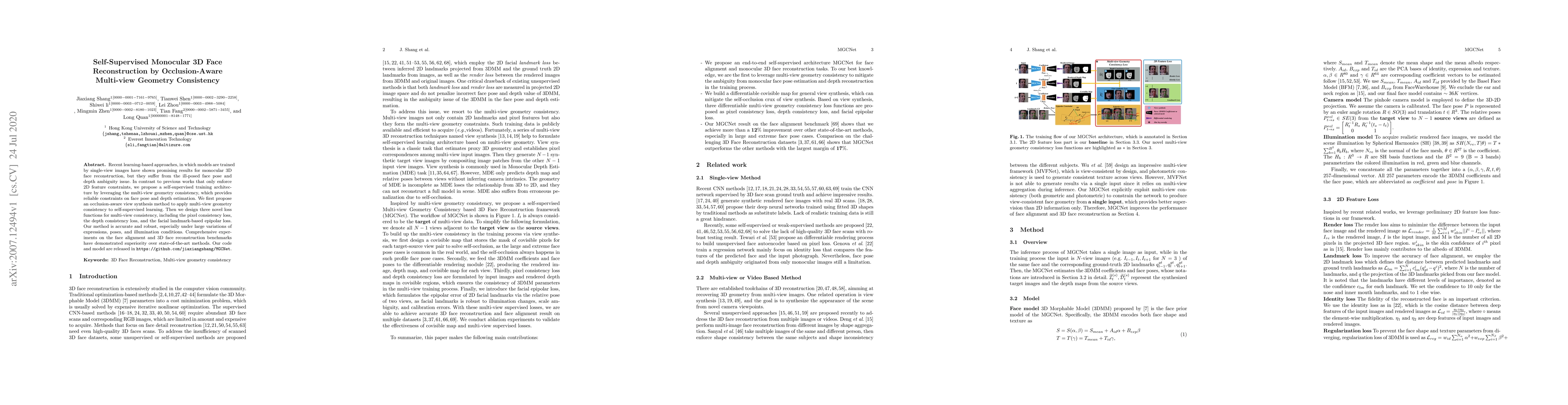 This paper introduces a self-supervised monocular 3D face reconstruction method that leverages multi-view geometry consistency and occlusion-aware view synthesis to provide reliable constraints on pose and depth estimation. The proposed method incorporates three novel loss functions to enhance multi-view consistency and demonstrates superior accuracy and robustness across various conditions.