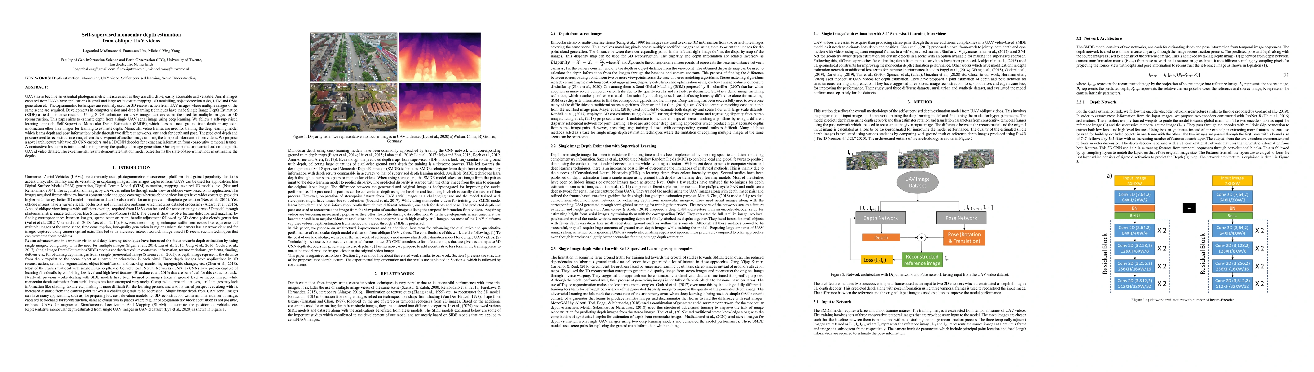 This paper proposes a self-supervised learning method for estimating depth from a single oblique UAV aerial image using deep learning. The approach, Self-Supervised Monocular Depth Estimation (SMDE), leverages monocular video frames to jointly learn depth and pose information, achieving superior depth estimation compared to state-of-the-art methods on the UAVid dataset.