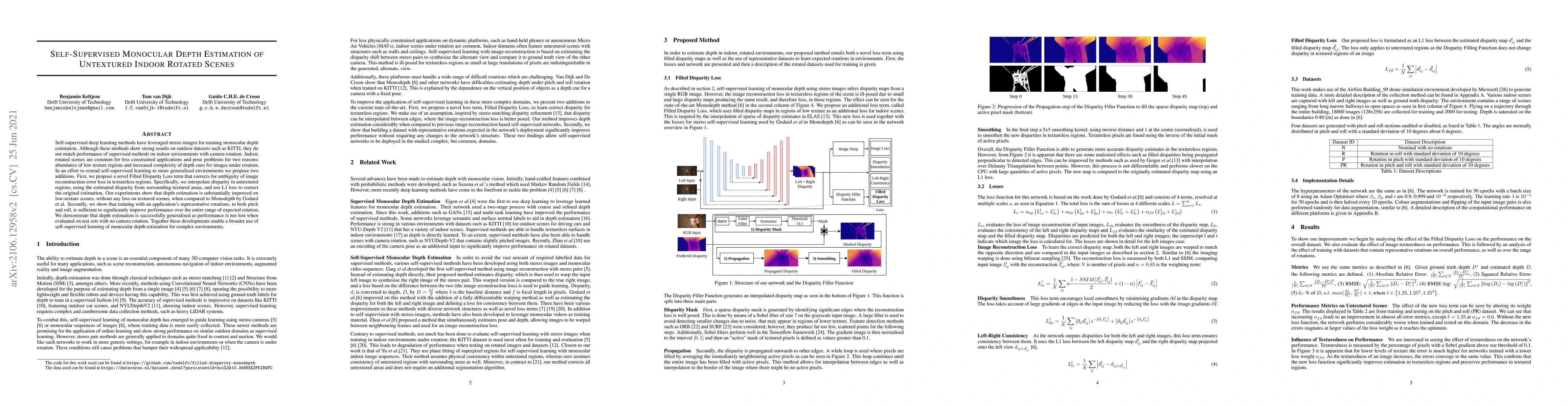 This paper proposes two enhancements to self-supervised monocular depth estimation for untextured indoor scenes under rotation: a novel Filled Disparity Loss to improve depth in textureless regions and training with representative rotations to generalize performance across various orientations. These methods substantially improve depth estimation in low-texture areas without compromising performance in textured regions.