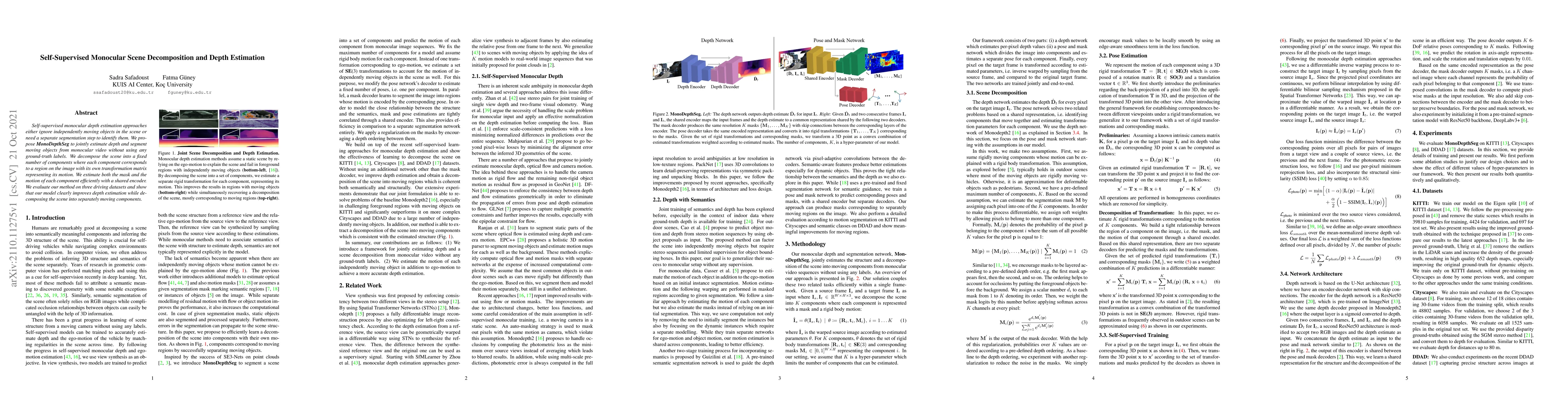 This paper introduces MonoDepthSeg, a self-supervised method for monocular depth estimation and moving object segmentation from video, without ground-truth labels. It decomposes the scene into components with individual transformation matrices for motion, improving depth estimation and object segmentation.