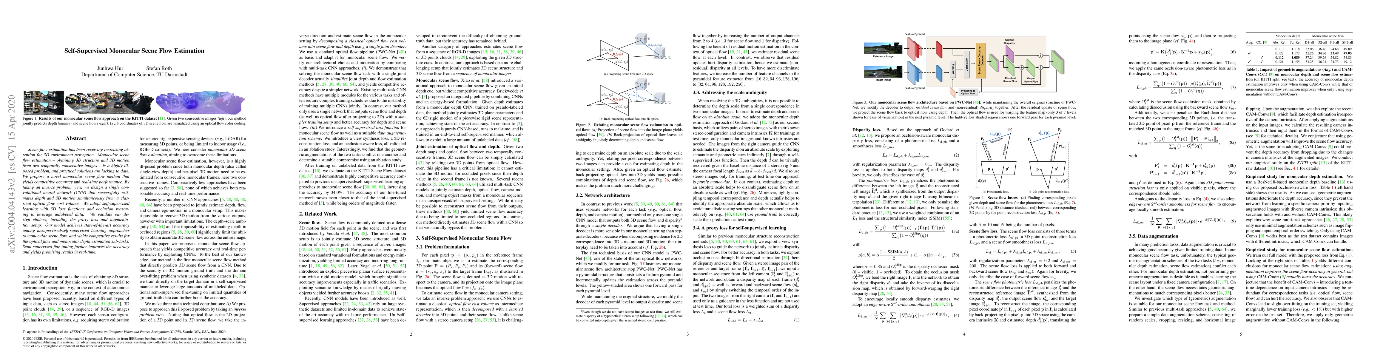 This paper proposes a self-supervised monocular scene flow estimation method using a single CNN that estimates depth and 3D motion from optical flow cost volumes. The approach leverages self-supervised learning with 3D loss functions and achieves state-of-the-art accuracy among self-supervised methods, with further improvements from semi-supervised fine-tuning.