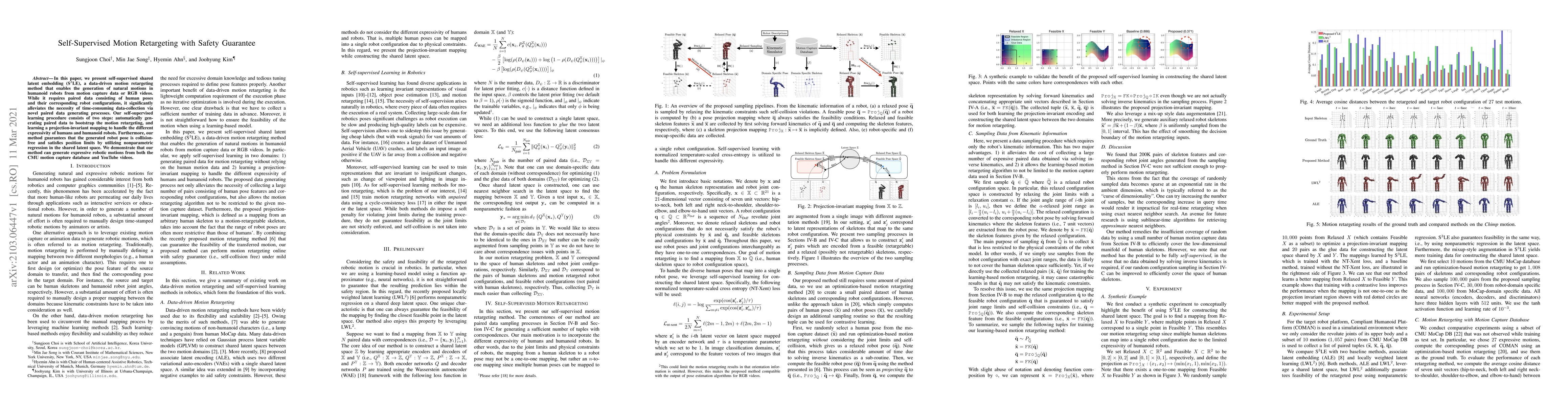 This paper introduces S3LE, a self-supervised method for motion retargeting in humanoid robots, reducing the need for extensive paired data collection. It guarantees safe, collision-free motions through nonparametric regression in a shared latent space.