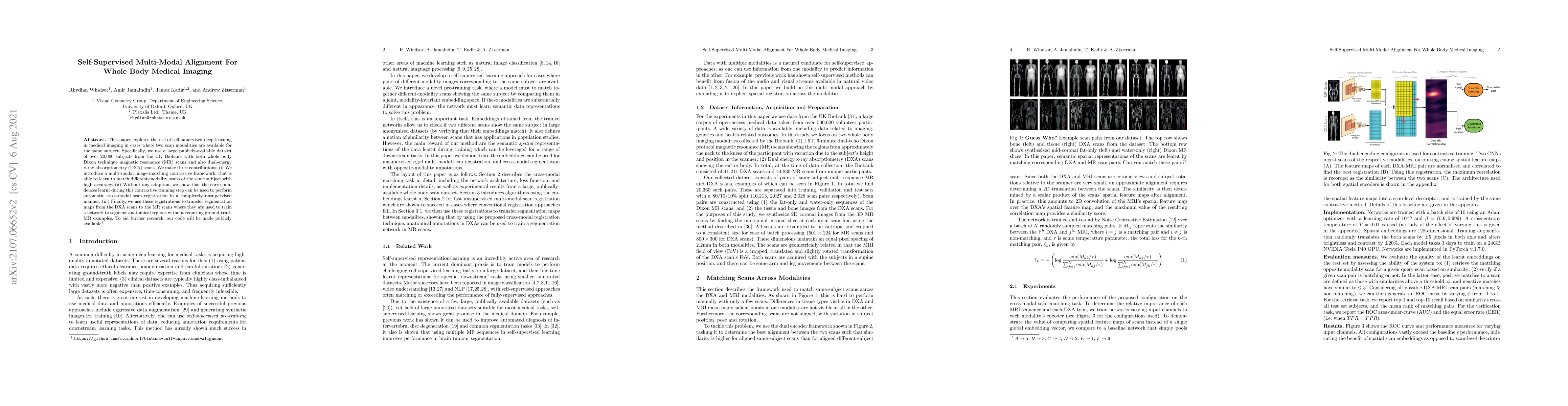 This paper explores the use of self-supervised deep learning in medical imaging in cases where two scan modalities are available for the same subject. Specifically, we use a large publicly-available dataset of over 20,000 subjects from the UK Biobank with both whole body Dixon technique magnetic resonance (MR) scans and also dual-energy x-ray absorptiometry (DXA) scans. We make three contributions: (i) We introduce a multi-modal image-matching contrastive framework, that is able to learn to match different-modality scans of the same subject with high accuracy. (ii) Without any adaption, we show that the correspondences learnt during this contrastive training step can be used to perform automatic cross-modal scan registration in a completely unsupervised manner. (iii) Finally, we use these registrations to transfer segmentation maps from the DXA scans to the MR scans where they are used to train a network to segment anatomical regions without requiring ground-truth MR examples. To aid further research, our code will be made publicly available.