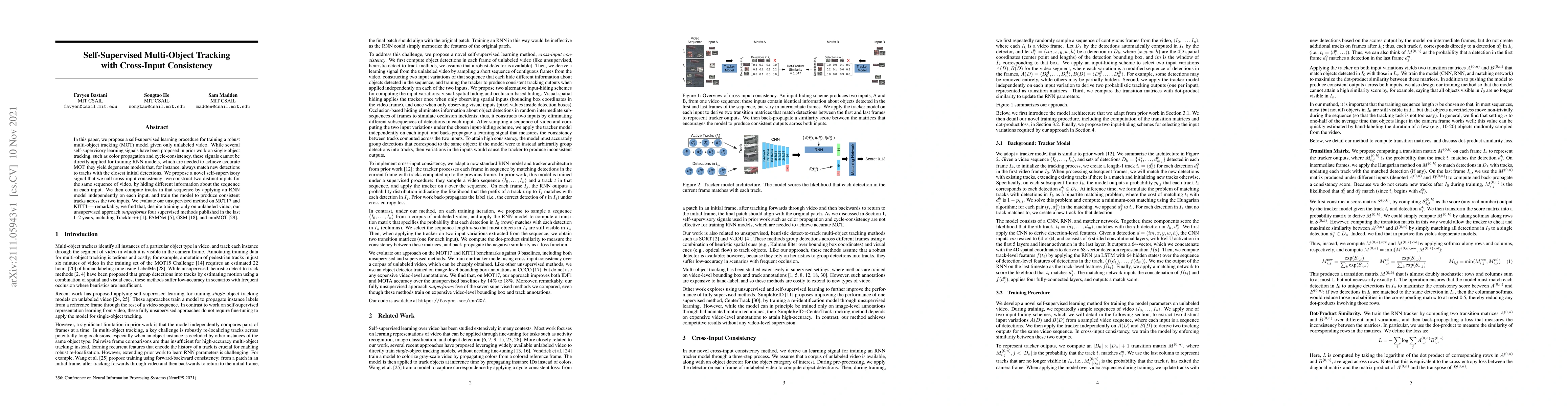 This paper introduces a self-supervised learning method for multi-object tracking using cross-input consistency, where two distinct inputs hide different information about the same video sequence. The proposed method outperforms several recent supervised tracking models on MOT17 and KITTI datasets.