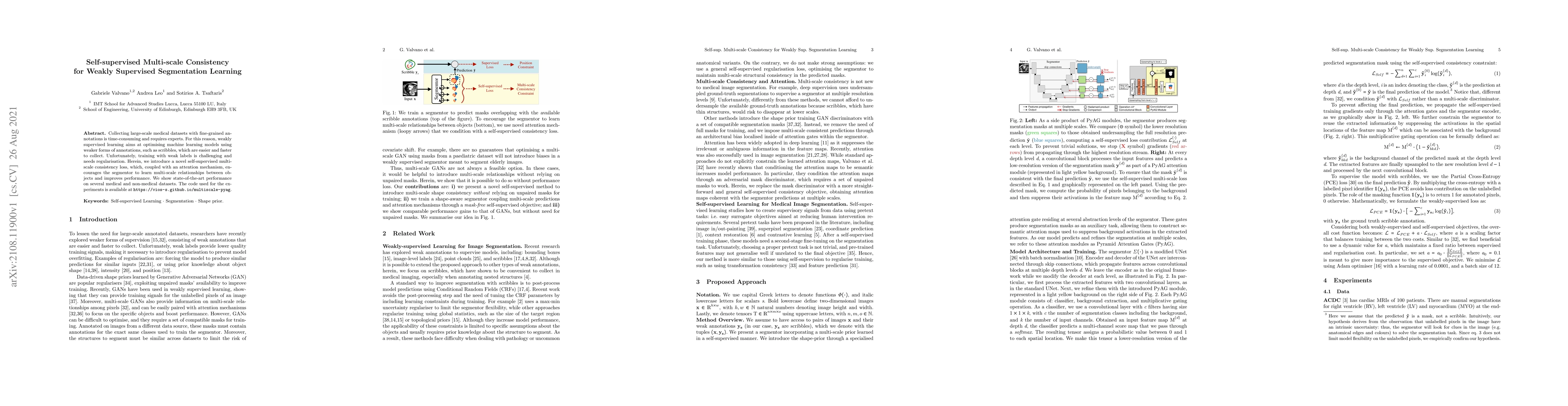 This paper proposes a self-supervised multi-scale consistency loss, combined with an attention mechanism, to improve weakly supervised segmentation learning using easier-to-collect weak annotations like scribbles. The method achieves state-of-the-art results on medical and non-medical datasets.