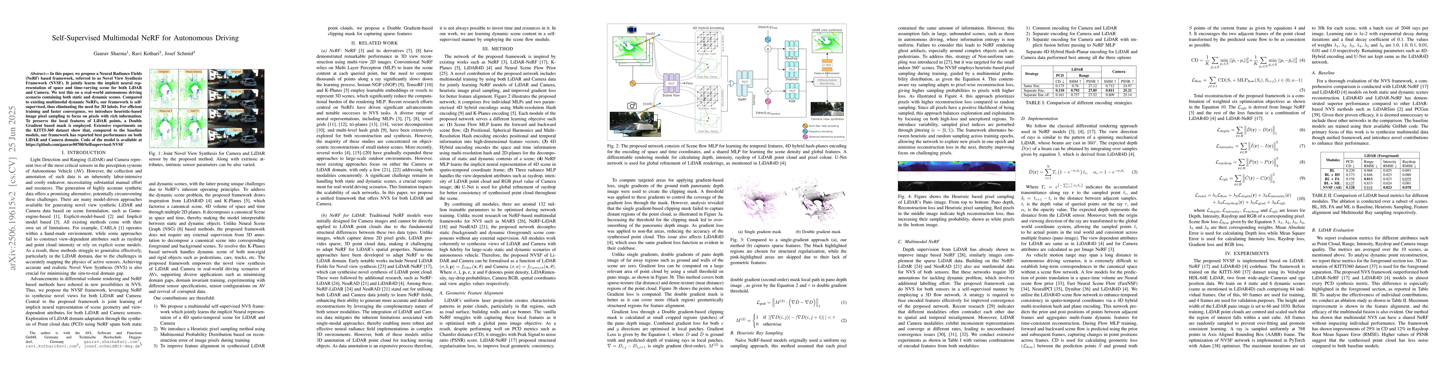 In this paper, we propose a Neural Radiance Fields (NeRF) based framework, referred to as Novel View Synthesis Framework (NVSF). It jointly learns the implicit neural representation of space and time-varying scene for both LiDAR and Camera. We test this on a real-world autonomous driving scenario containing both static and dynamic scenes. Compared to existing multimodal dynamic NeRFs, our framework is self-supervised, thus eliminating the need for 3D labels. For efficient training and faster convergence, we introduce heuristic-based image pixel sampling to focus on pixels with rich information. To preserve the local features of LiDAR points, a Double Gradient based mask is employed. Extensive experiments on the KITTI-360 dataset show that, compared to the baseline models, our framework has reported best performance on both LiDAR and Camera domain. Code of the model is available at https://github.com/gaurav00700/Selfsupervised-NVSF