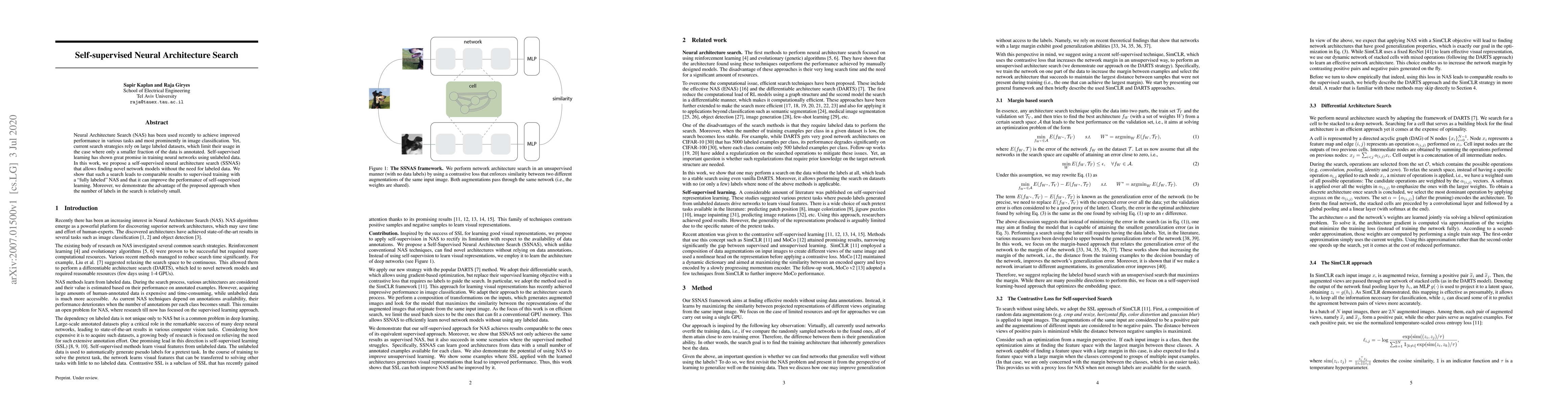 This paper proposes a self-supervised neural architecture search (SSNAS) method that discovers novel network models without relying on labeled data, leveraging self-supervised learning. The results show that SSNAS achieves comparable performance to supervised NAS and enhances self-supervised learning, especially when labeled data is scarce.