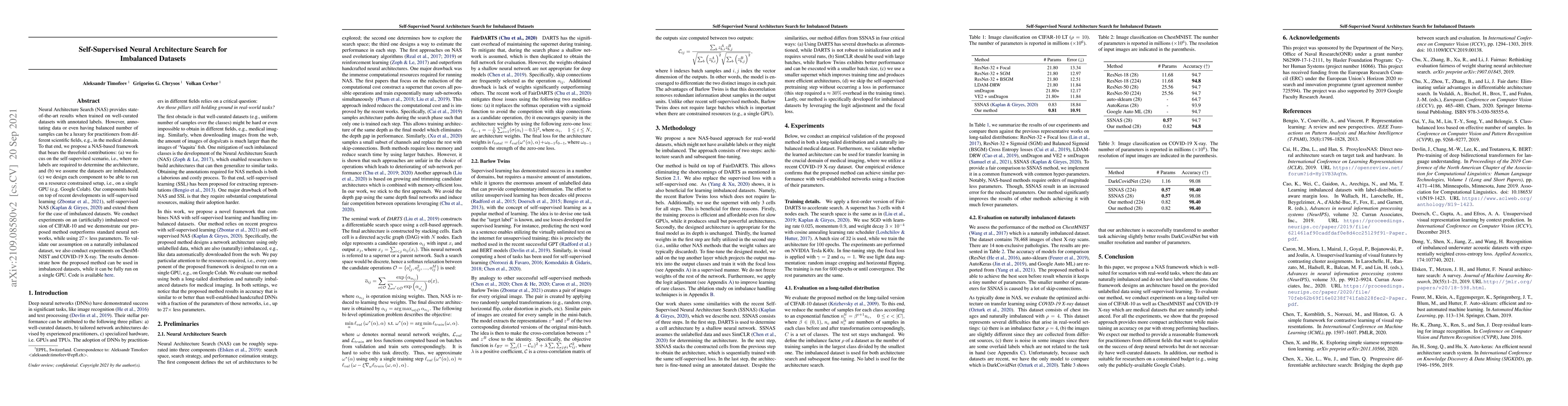 This paper proposes a self-supervised Neural Architecture Search (NAS) framework for handling imbalanced datasets without requiring labeled data. The method is designed to run on resource-constrained environments and demonstrates superior performance on imbalanced versions of CIFAR-10, ChestMNIST, and COVID-19 X-ray datasets, using significantly fewer parameters.
