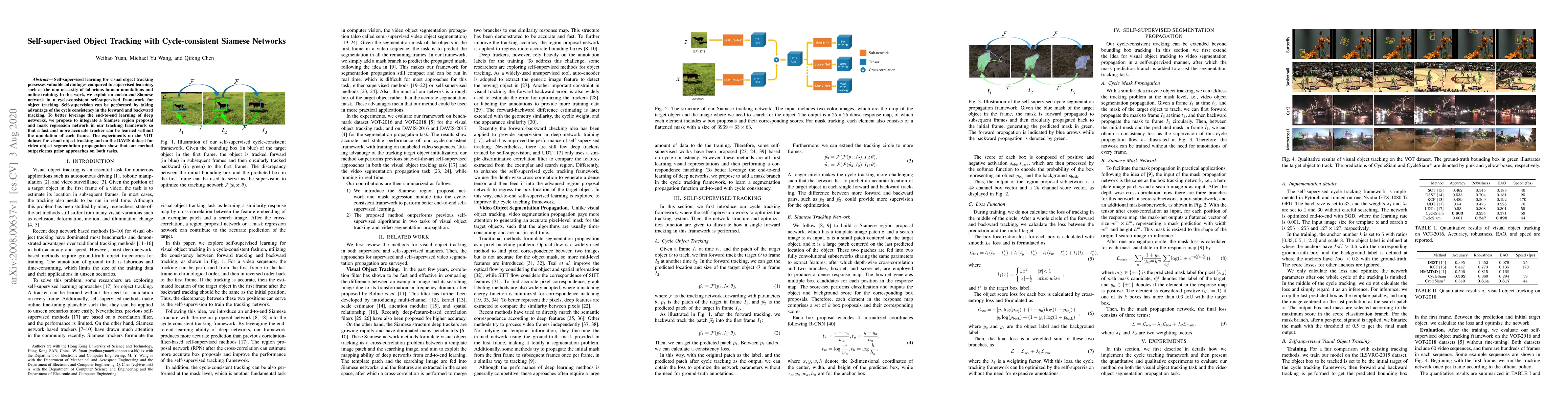 This paper proposes a self-supervised object tracking method using cycle-consistent Siamese networks, eliminating the need for frame-by-frame annotations. The approach leverages cycle consistency in forward and backward tracking, integrating a Siamese region proposal and mask regression network for improved accuracy and speed. Experimental results on VOT and DAVIS datasets demonstrate superior performance compared to prior methods.