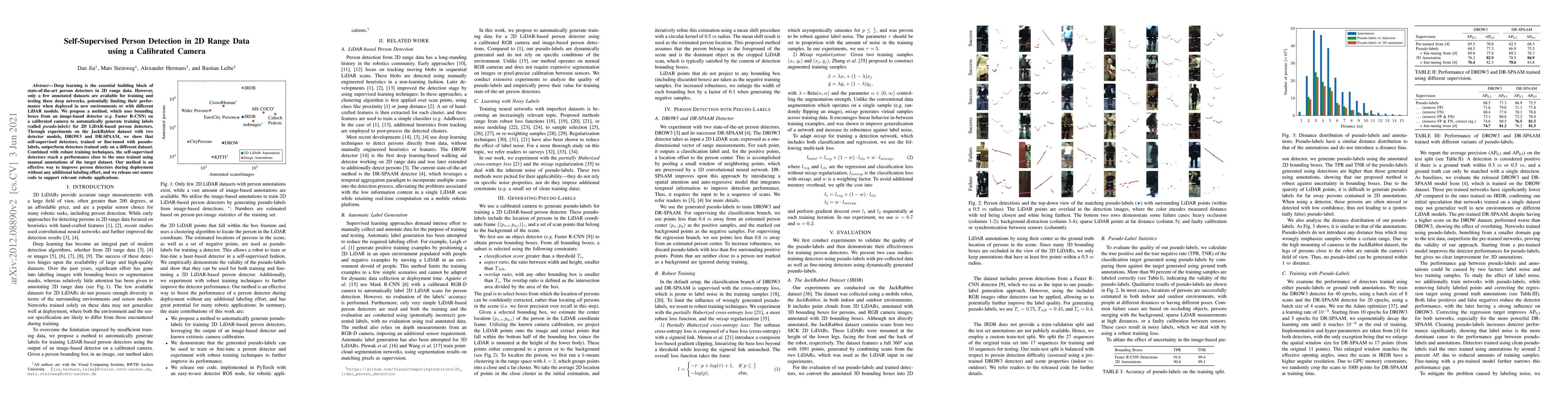 This research introduces a self-supervised method for person detection in 2D LiDAR data using a calibrated camera. By generating pseudo-labels from an image-based detector, the proposed approach improves 2D LiDAR-based detector performance, even surpassing those trained on different datasets. The method simplifies detector deployment in new environments without manual annotation effort.