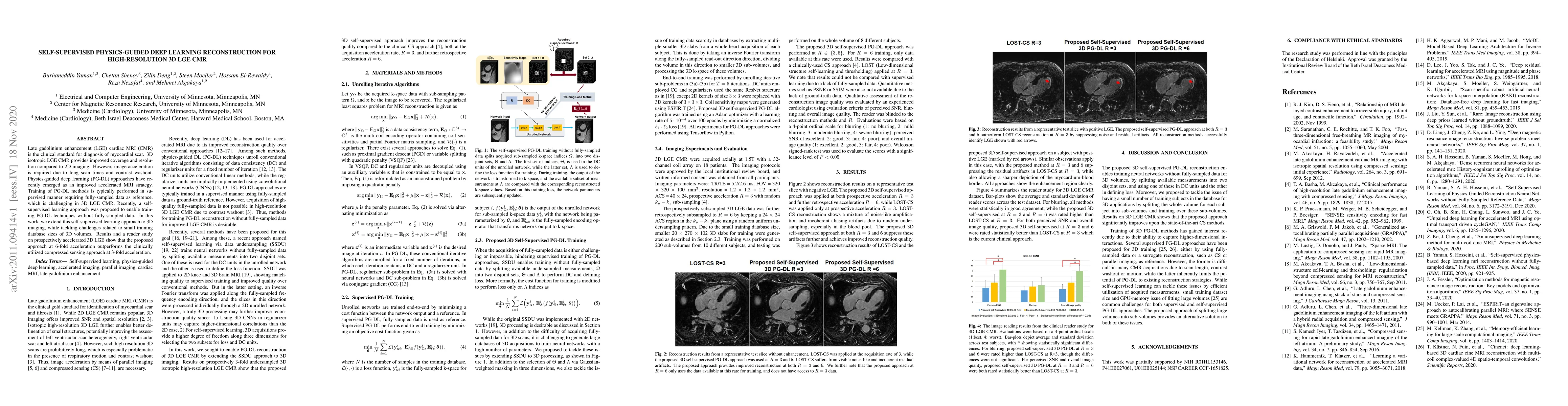 This paper proposes a self-supervised physics-guided deep learning method for reconstructing high-resolution 3D LGE CMR images, achieving 6-fold acceleration without requiring fully-sampled data. The approach outperforms traditional compressed sensing methods in a reader study.