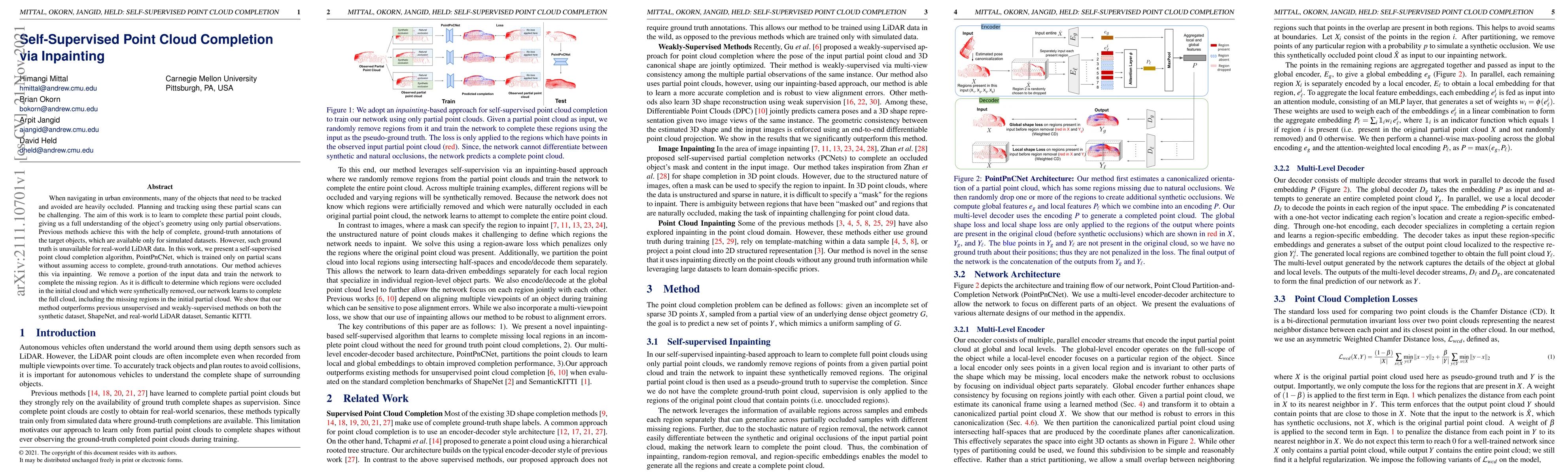 This paper introduces PointPnCNet, a self-supervised algorithm for completing partial point clouds via inpainting. Unlike previous methods, it does not require ground-truth annotations, instead training on partial scans to learn to fill in missing regions. The method outperforms other unsupervised and weakly-supervised techniques on both synthetic and real-world LiDAR datasets.