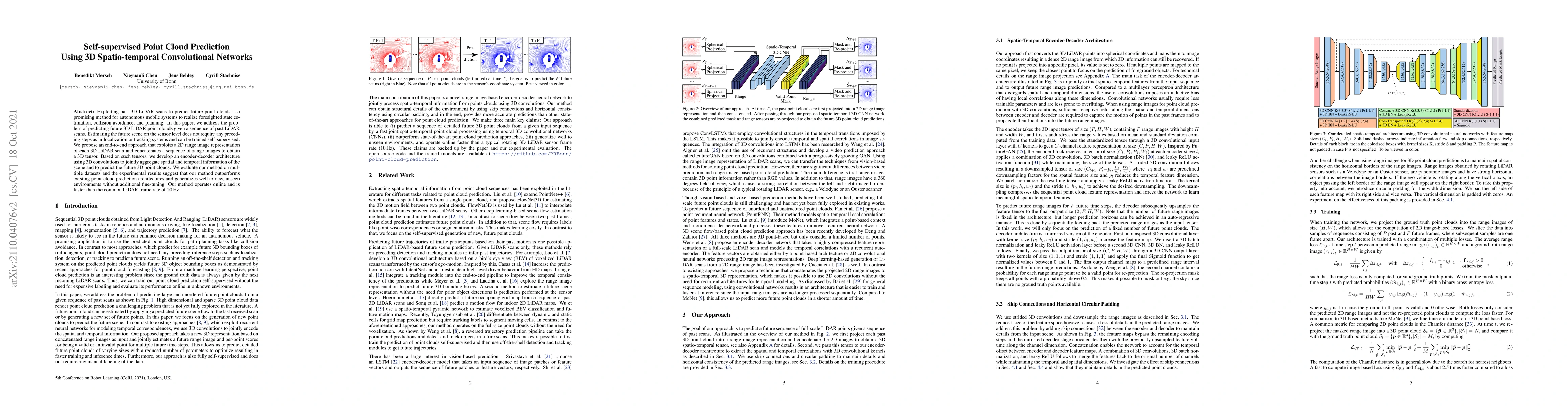 This paper proposes a self-supervised method to predict future 3D LiDAR point clouds using 3D spatio-temporal convolutional networks, outperforming existing architectures and generalizing well to new environments.