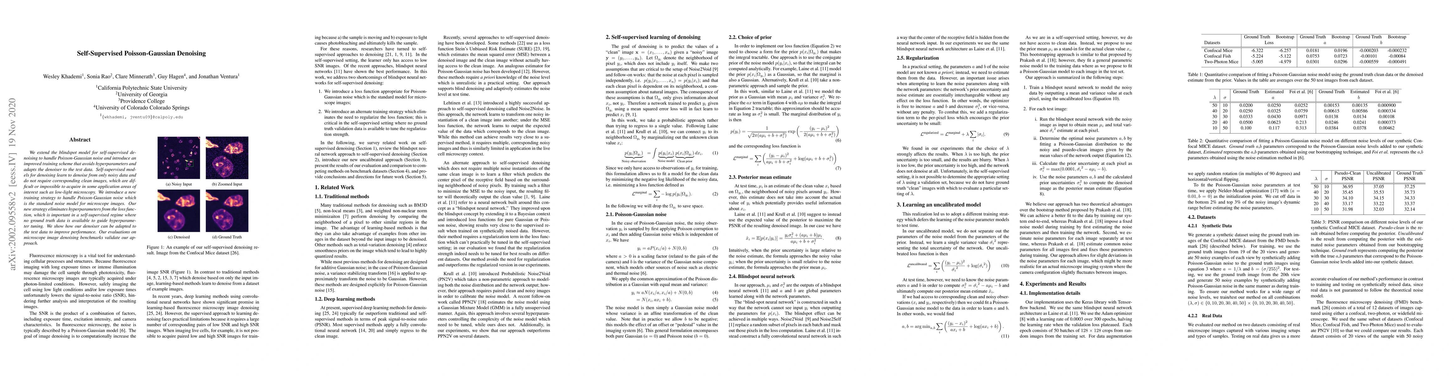 This paper proposes a self-supervised denoising method for handling Poisson-Gaussian noise, eliminating the need for hyperparameters and adapting the denoiser to the test data. The approach is validated through benchmarks in low-light microscopy, demonstrating improved performance without clean image ground truth.