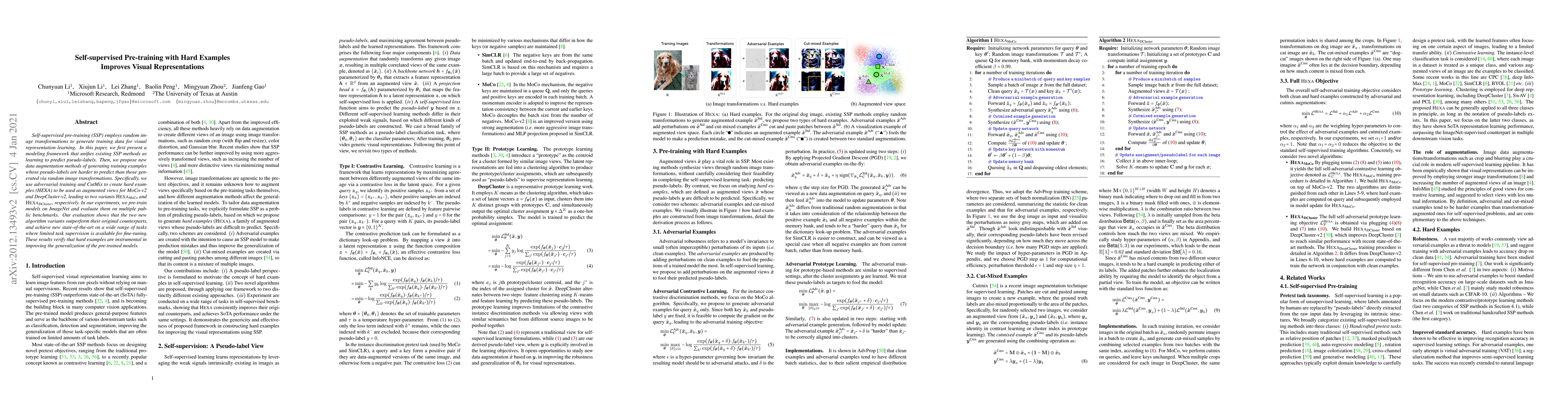 This paper introduces a framework for self-supervised pre-training that leverages hard examples generated through adversarial training and CutMix to improve visual representation learning. The proposed HEXA variants of MoCo-v2 and DeepCluster-v2 achieve state-of-the-art results on multiple benchmarks, demonstrating the effectiveness of hard examples in enhancing model generalization.