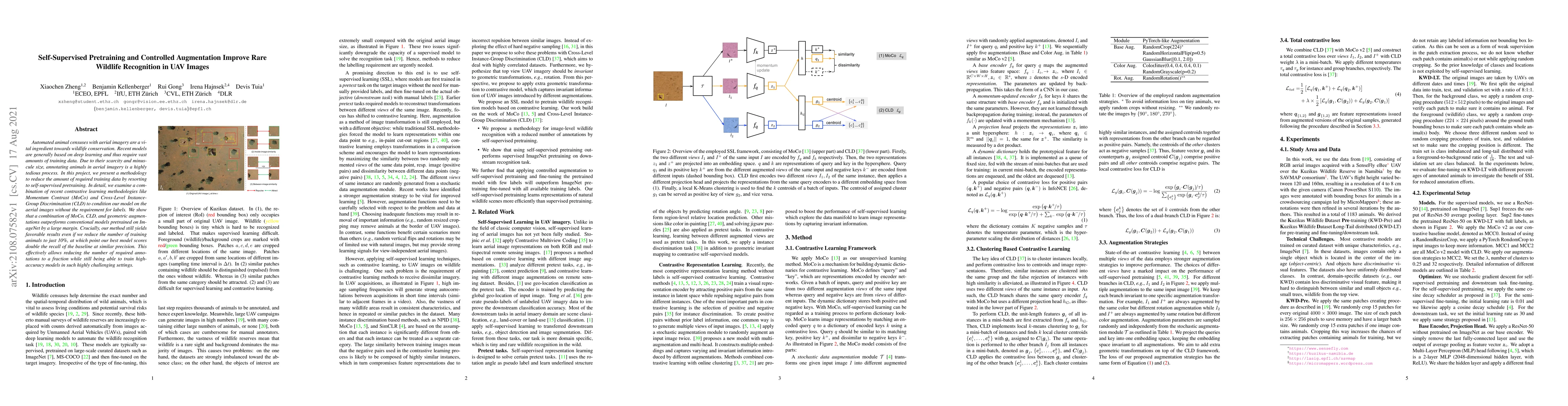 This research introduces a method using self-supervised pretraining with Momentum Contrast (MoCo) and Cross-Level Instance-Group Discrimination (CLD) to improve rare wildlife recognition in UAV images. The approach significantly reduces required training data, achieving double the recall of baseline models at similar precision with just 10% of training animals, thus drastically cutting annotation efforts for wildlife conservation.