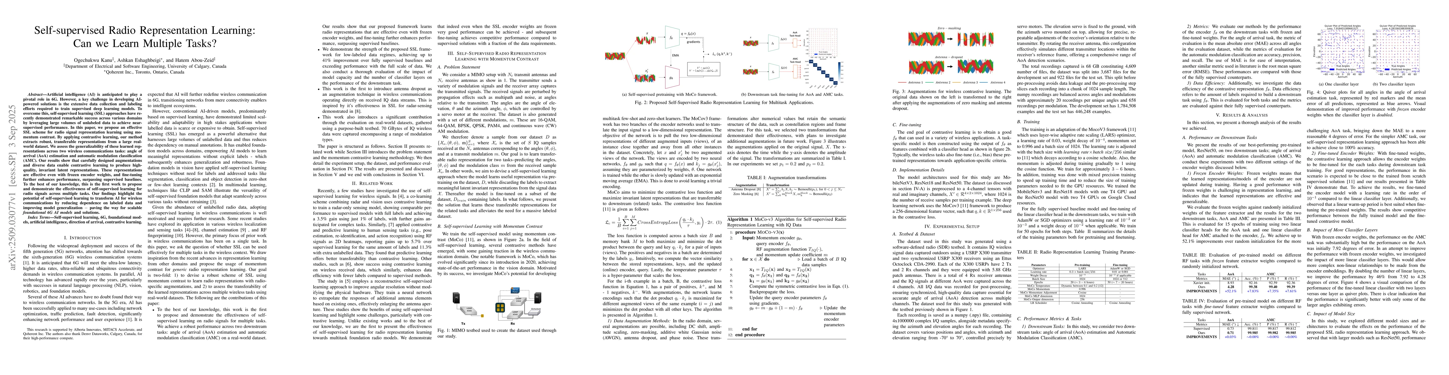 Artificial intelligence (AI) is anticipated to play a pivotal role in 6G. However, a key challenge in developing AI-powered solutions is the extensive data collection and labeling efforts required to train supervised deep learning models. To overcome this, self-supervised learning (SSL) approaches have recently demonstrated remarkable success across various domains by leveraging large volumes of unlabeled data to achieve near-supervised performance. In this paper, we propose an effective SSL scheme for radio signal representation learning using momentum contrast. By applying contrastive learning, our method extracts robust, transferable representations from a large real-world dataset. We assess the generalizability of these learned representations across two wireless communications tasks: angle of arrival (AoA) estimation and automatic modulation classification (AMC). Our results show that carefully designed augmentations and diverse data enable contrastive learning to produce high-quality, invariant latent representations. These representations are effective even with frozen encoder weights, and fine-tuning further enhances performance, surpassing supervised baselines. To the best of our knowledge, this is the first work to propose and demonstrate the effectiveness of self-supervised learning for radio signals across multiple tasks. Our findings highlight the potential of self-supervised learning to transform AI for wireless communications by reducing dependence on labeled data and improving model generalization - paving the way for scalable foundational 6G AI models and solutions.