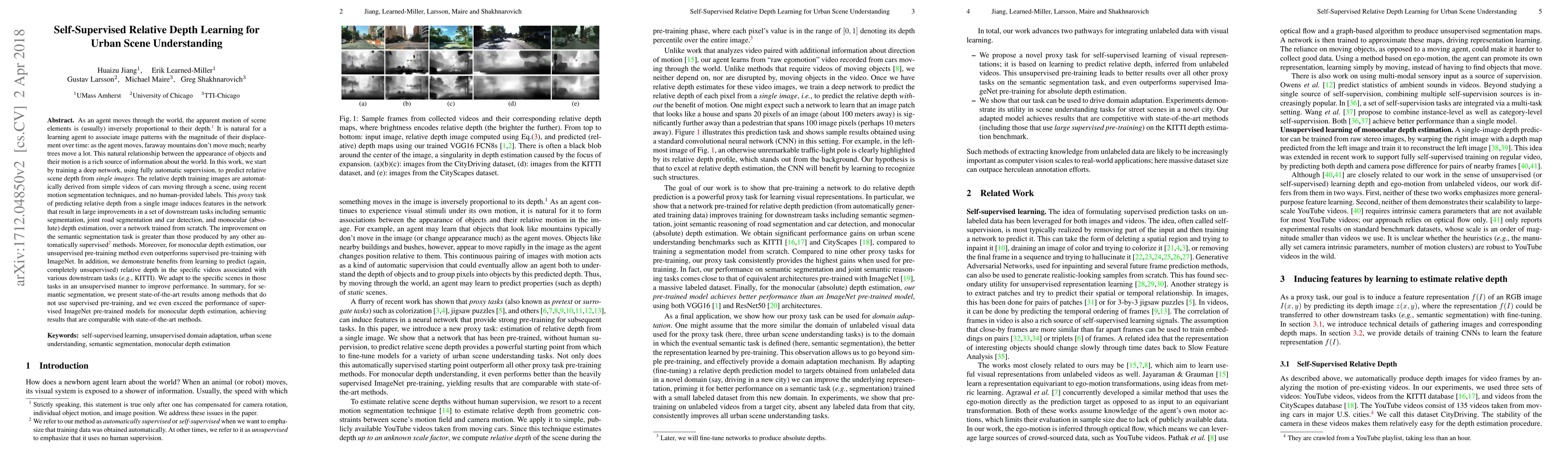 As an agent moves through the world, the apparent motion of scene elements is (usually) inversely proportional to their depth. It is natural for a learning agent to associate image patterns with the magnitude of their displacement over time: as the agent moves, faraway mountains don't move much; nearby trees move a lot. This natural relationship between the appearance of objects and their motion is a rich source of information about the world. In this work, we start by training a deep network, using fully automatic supervision, to predict relative scene depth from single images. The relative depth training images are automatically derived from simple videos of cars moving through a scene, using recent motion segmentation techniques, and no human-provided labels. This proxy task of predicting relative depth from a single image induces features in the network that result in large improvements in a set of downstream tasks including semantic segmentation, joint road segmentation and car detection, and monocular (absolute) depth estimation, over a network trained from scratch. The improvement on the semantic segmentation task is greater than those produced by any other automatically supervised methods. Moreover, for monocular depth estimation, our unsupervised pre-training method even outperforms supervised pre-training with ImageNet. In addition, we demonstrate benefits from learning to predict (unsupervised) relative depth in the specific videos associated with various downstream tasks. We adapt to the specific scenes in those tasks in an unsupervised manner to improve performance. In summary, for semantic segmentation, we present state-of-the-art results among methods that do not use supervised pre-training, and we even exceed the performance of supervised ImageNet pre-trained models for monocular depth estimation, achieving results that are comparable with state-of-the-art methods.