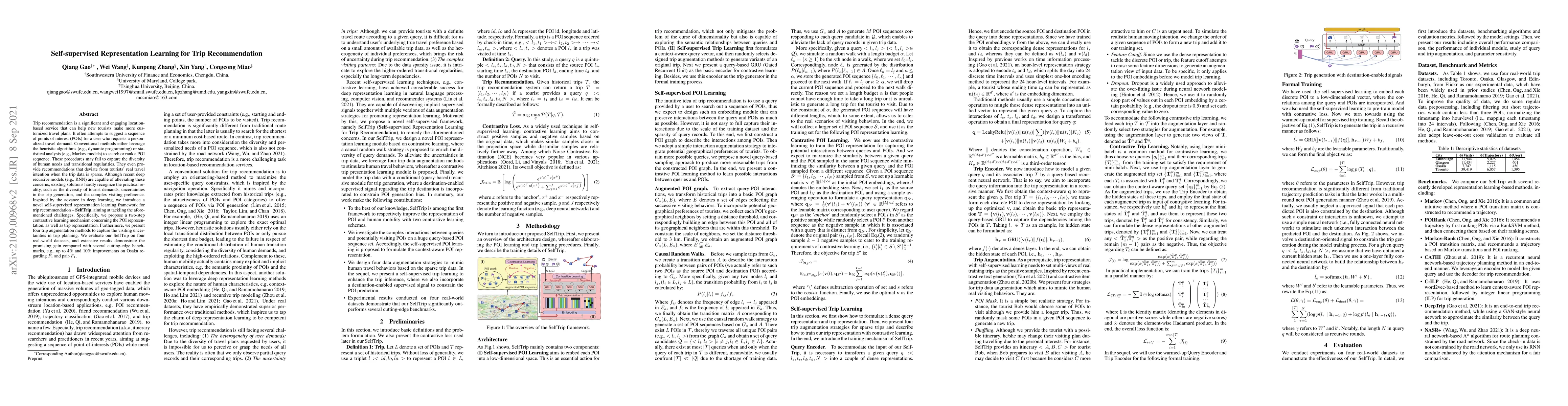 This paper introduces SelfTrip, a self-supervised representation learning framework for trip recommendation, aiming to better capture the diversity of tourist needs and uncertainties. It employs a two-step contrastive learning mechanism and four trip augmentation methods, achieving up to 4% and 12% improvements on F1 and pair-F1 metrics compared to state-of-the-art benchmarks.