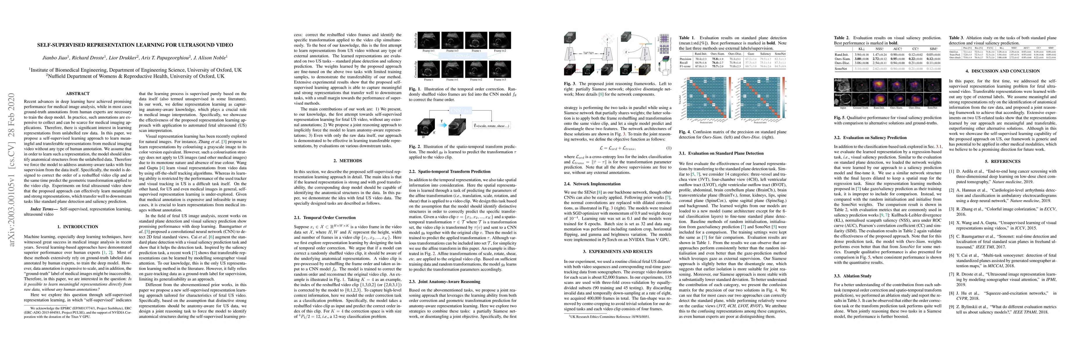 This paper proposes a self-supervised learning method to derive meaningful representations from unlabeled ultrasound video data, eliminating the need for human annotations. The model learns by predicting the order of reshuffled clips and identifying geometric transformations, demonstrating effective transfer to tasks like plane detection and saliency prediction.