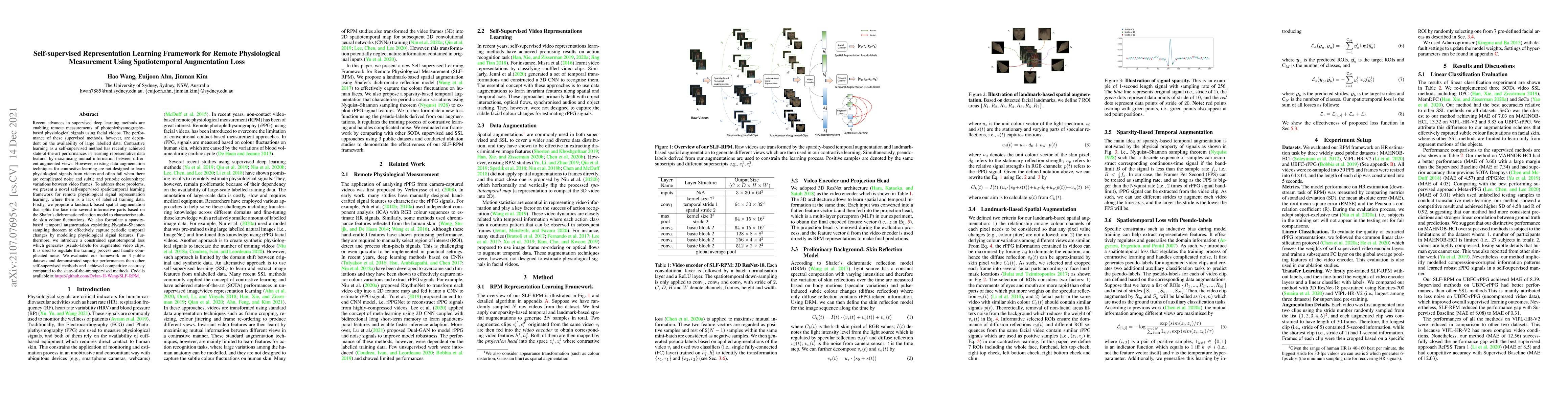 This paper introduces a self-supervised learning framework for remote physiological signal measurement using facial videos, addressing the lack of labelled data. It proposes spatial and temporal augmentation techniques to capture subtle and periodic variations in video frames, and a spatiotemporal loss to generate pseudo-labels, achieving superior performance compared to other self-supervised methods and competitive accuracy to supervised methods.