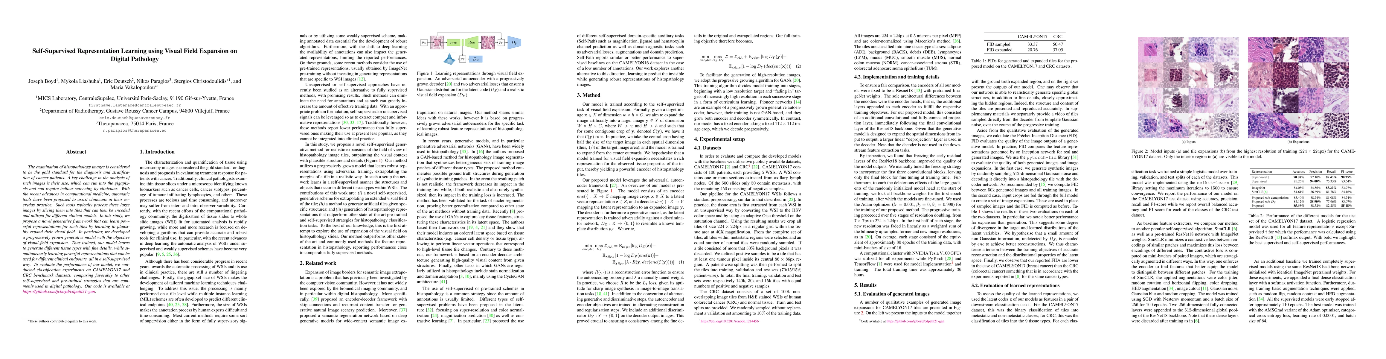 This paper proposes a self-supervised generative framework for learning representations from large histopathology images by expanding their visual fields. The model, trained progressively, generates tissue types with fine details and outperforms other methods in classification tasks on CAMELYON17 and CRC datasets.