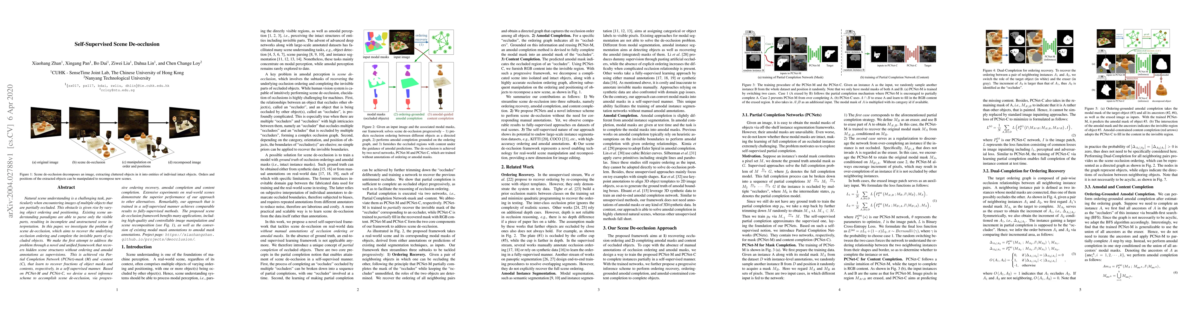 This paper proposes a self-supervised framework for scene de-occlusion, using Partial Completion Networks to recover hidden scene structures and complete occluded object parts without requiring ordering or amodal annotations. The approach demonstrates superior performance in real-world scenes and achieves comparable results to fully-supervised methods.