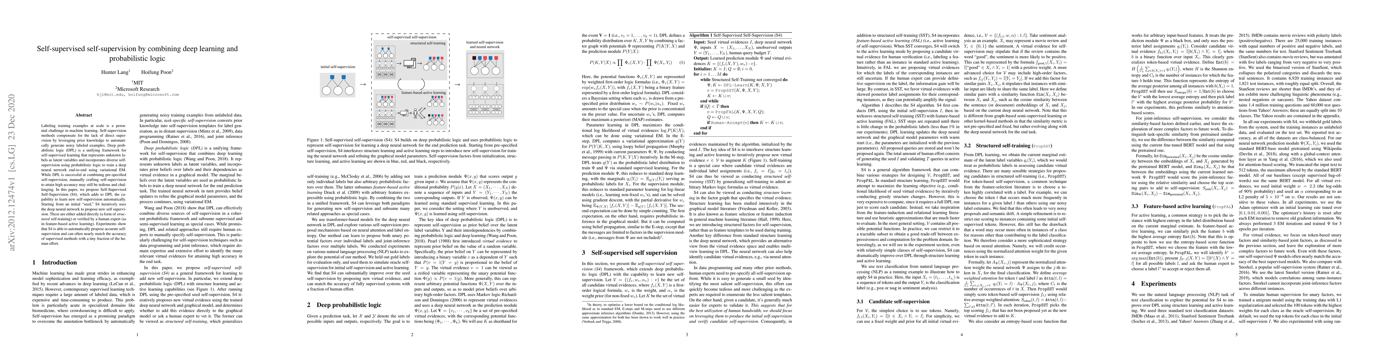 This paper introduces Self-Supervised Self-Supervision (S4), an enhancement to deep probabilistic logic (DPL) that automates the generation of self-supervision by iteratively proposing new self-supervision from an initial "seed" and either directly incorporating it or verifying it with human input. Experiments demonstrate S4's ability to nearly match supervised methods' accuracy with minimal human effort.