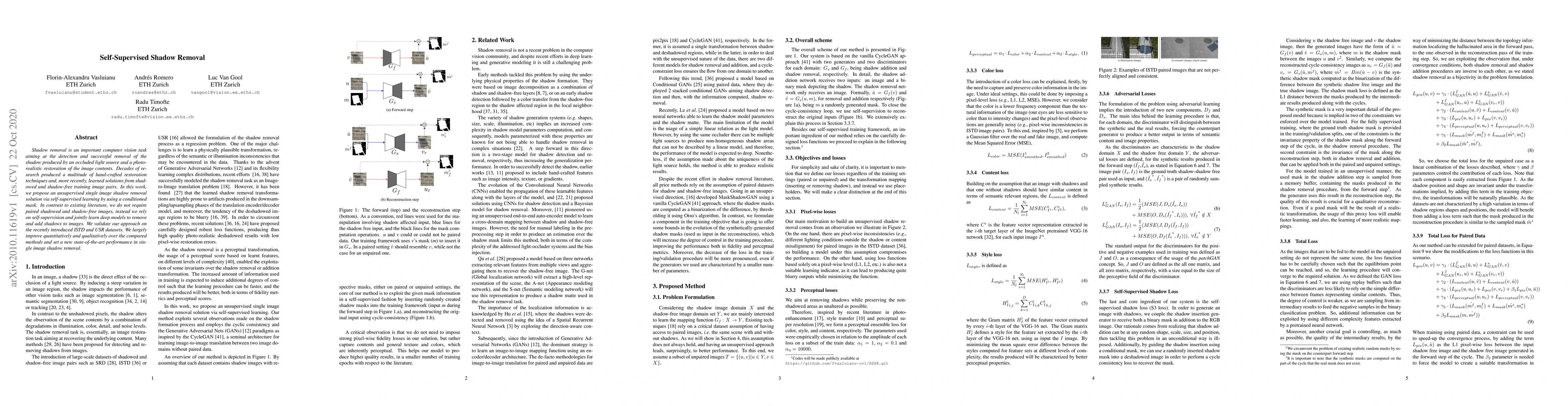 This paper proposes an unsupervised method for single image shadow removal using self-supervised learning with a conditioned mask, eliminating the need for paired training data. The approach sets a new state-of-the-art in single image shadow removal, outperforming existing methods on ISTD and USR datasets.