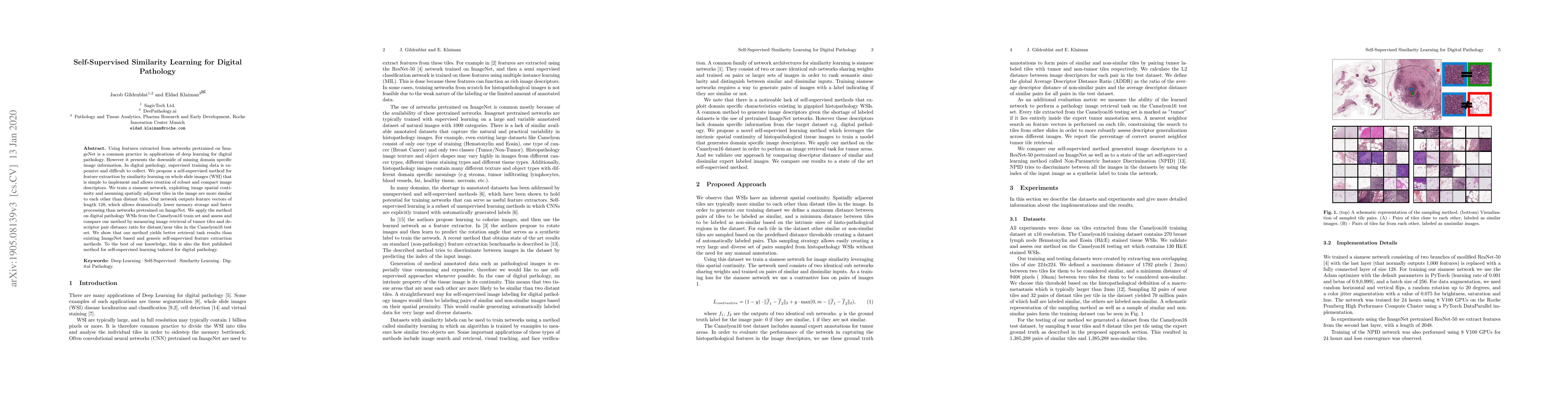 Using features extracted from networks pretrained on ImageNet is a common practice in applications of deep learning for digital pathology. However it presents the downside of missing domain specific image information. In digital pathology, supervised training data is expensive and difficult to collect. We propose a self-supervised method for feature extraction by similarity learning on whole slide images (WSI) that is simple to implement and allows creation of robust and compact image descriptors. We train a siamese network, exploiting image spatial continuity and assuming spatially adjacent tiles in the image are more similar to each other than distant tiles. Our network outputs feature vectors of length 128, which allows dramatically lower memory storage and faster processing than networks pretrained on ImageNet. We apply the method on digital pathology WSIs from the Camelyon16 train set and assess and compare our method by measuring image retrieval of tumor tiles and descriptor pair distance ratio for distant/near tiles in the Camelyon16 test set. We show that our method yields better retrieval task results than existing ImageNet based and generic self-supervised feature extraction methods. To the best of our knowledge, this is also the first published method for self-supervised learning tailored for digital pathology.