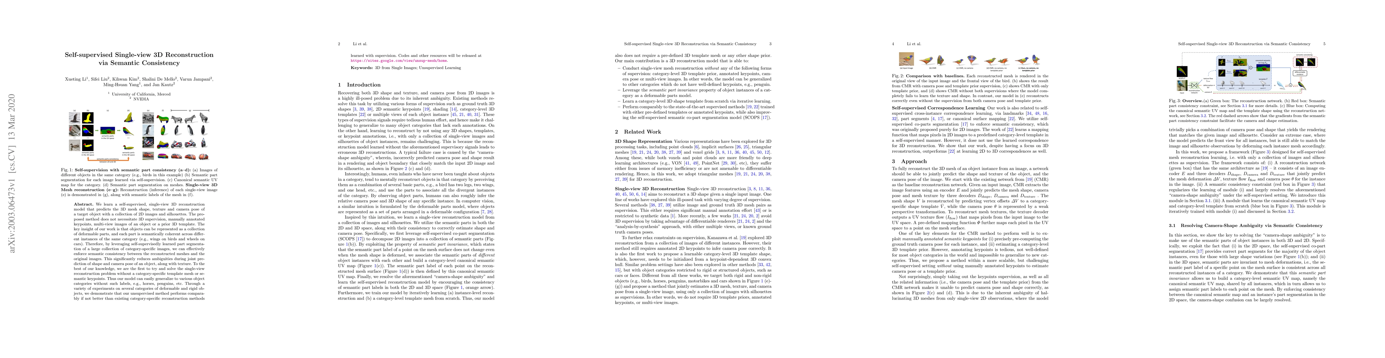 This paper proposes a self-supervised model for single-view 3D reconstruction that predicts 3D mesh, texture, and camera pose using only 2D images and silhouettes. It leverages semantic consistency across deformable parts to generalize to various object categories without requiring 3D supervision or specific templates.