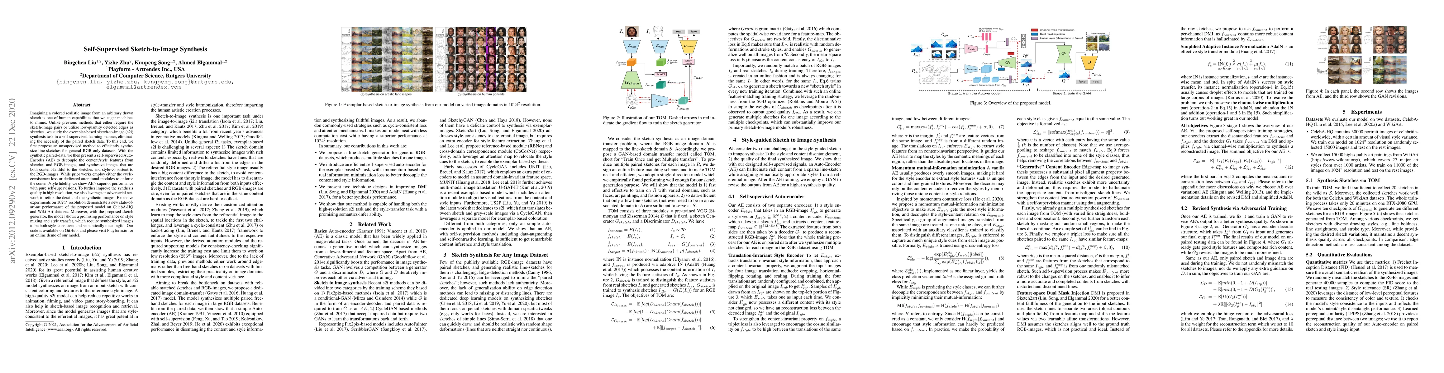This paper proposes a self-supervised learning method for sketch-to-image synthesis, eliminating the need for paired sketch-image data. It introduces an unsupervised sketch generator and a self-supervised auto-encoder to achieve high-resolution, content-faithful, and style-consistent image synthesis, outperforming previous methods.