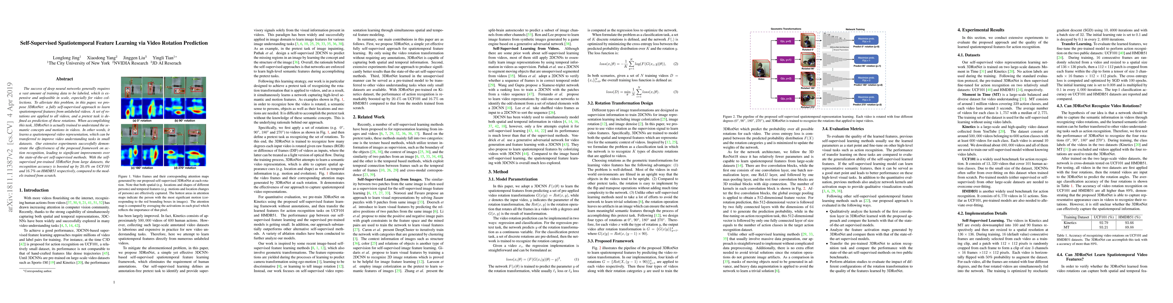 The paper proposes 3DRotNet, a self-supervised approach for learning spatiotemporal features from unlabeled videos using video rotation prediction as a pretext task.