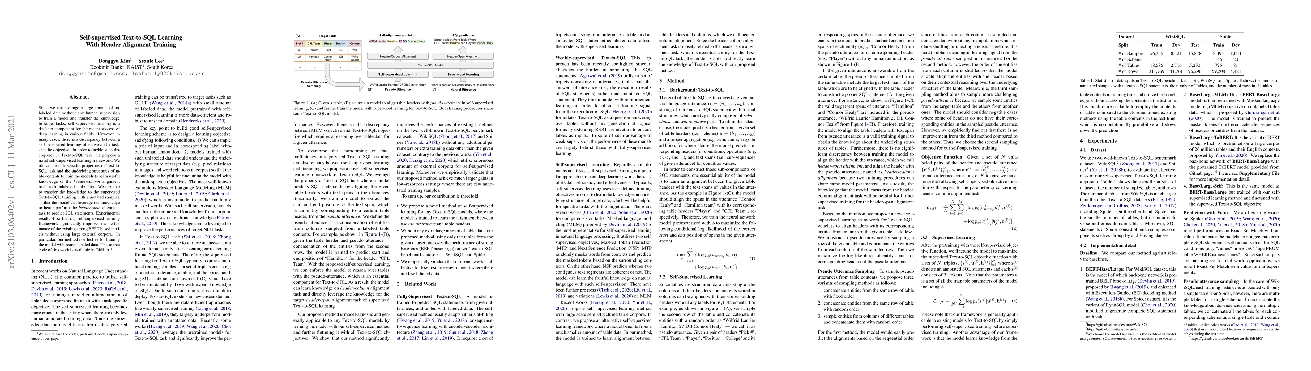 This paper proposes a self-supervised learning framework for Text-to-SQL tasks that leverages header-column alignment from unlabeled table data to improve model performance. The method effectively transfers this knowledge to supervised training, enhancing the model's ability to perform header-span alignment and predict SQL statements, especially with limited labeled data.